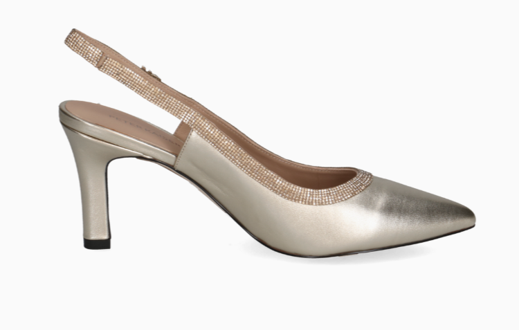 The PETER KAISER Gold Slingback Shoe features stunning Diamante Detail for a touch of elegance.