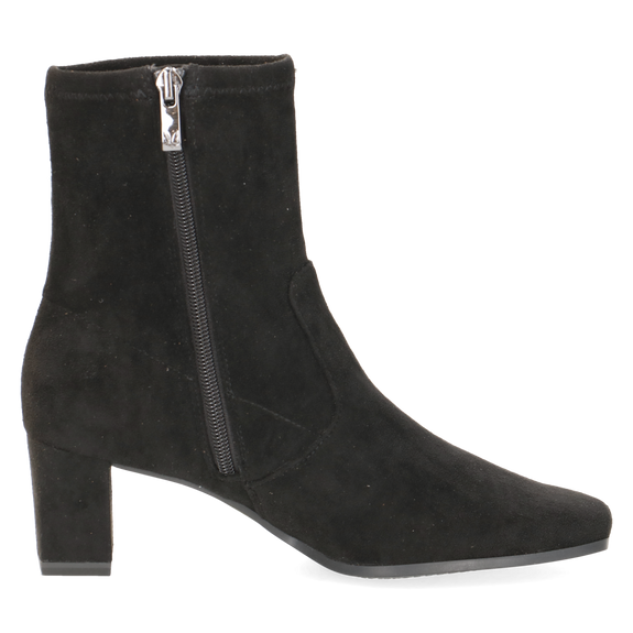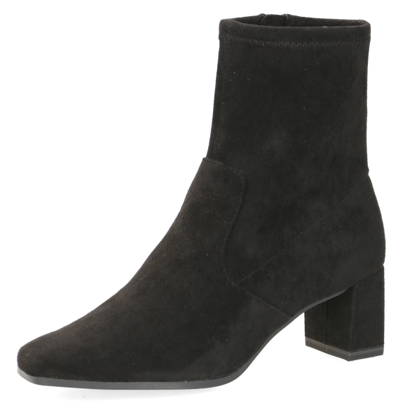 CAPRICE Black Suede Stretch Ankle Boot .Expertly crafted with black stretch suede , these ankle boots feature a chic squared toe and a cushioned sole for ultimate comfort. Complete with a convenient side zip, this versatile boot is perfect for any occasion, day or night. Made with high-quality materials including leather, textile, and manmade components, this boot stands at a stylish heel height of 6 cm.