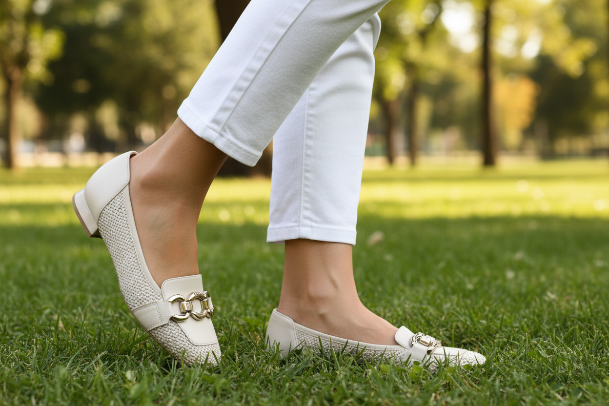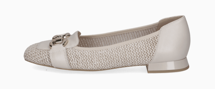 This CAPRICE loafer combines timeless elegance with practical comfort for the season ahead. The woven leather upper is finished with a polished gold buckle—a refined accent that transitions effortlessly from casual to smart-casual settings. Designed in the wider G-fit for all-day wearability, it features a leather lining for breathability and a supportive 20mm heel. The durable manmade sole ensures longevity through frequent wear. Style No: 24201.