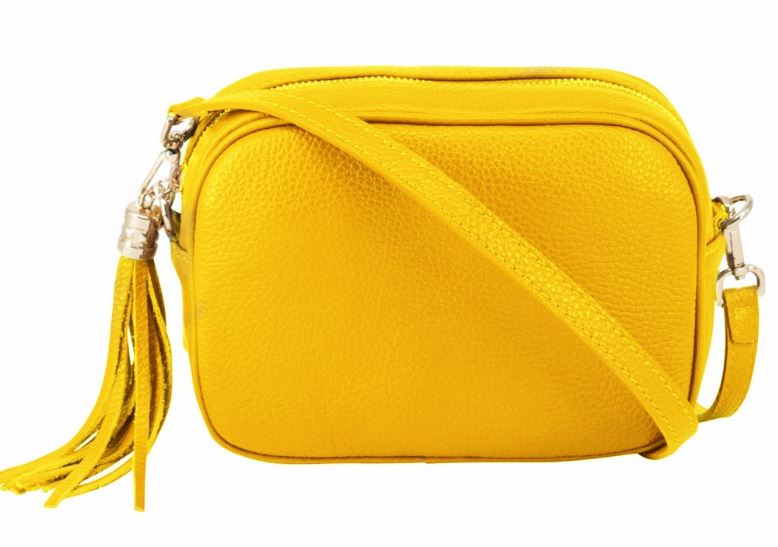 A soft grained yelllow crossbody bag with tassel. This crossbody handbag comes with one centre zip and an interior pocket.It has an adjustable/detachable  leather strap that can be worn on the shoulder or crossbody .We sell other decorative and  chain straps  separately if you'd like to change up your look.