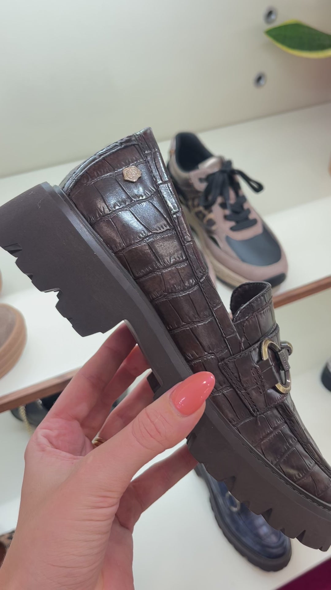 Enhance your daily wardrobe with the CARMELA Brown Croc Loafer, combining refined elegance, contemporary style, and superior comfort. Perfect for both professional settings and casual outings, this chunky loafer offers a sophisticated look without compromising on wearability. Crafted with a leather upper and lining, paired with a durable manmade sole for lasting quality. Removable insole.