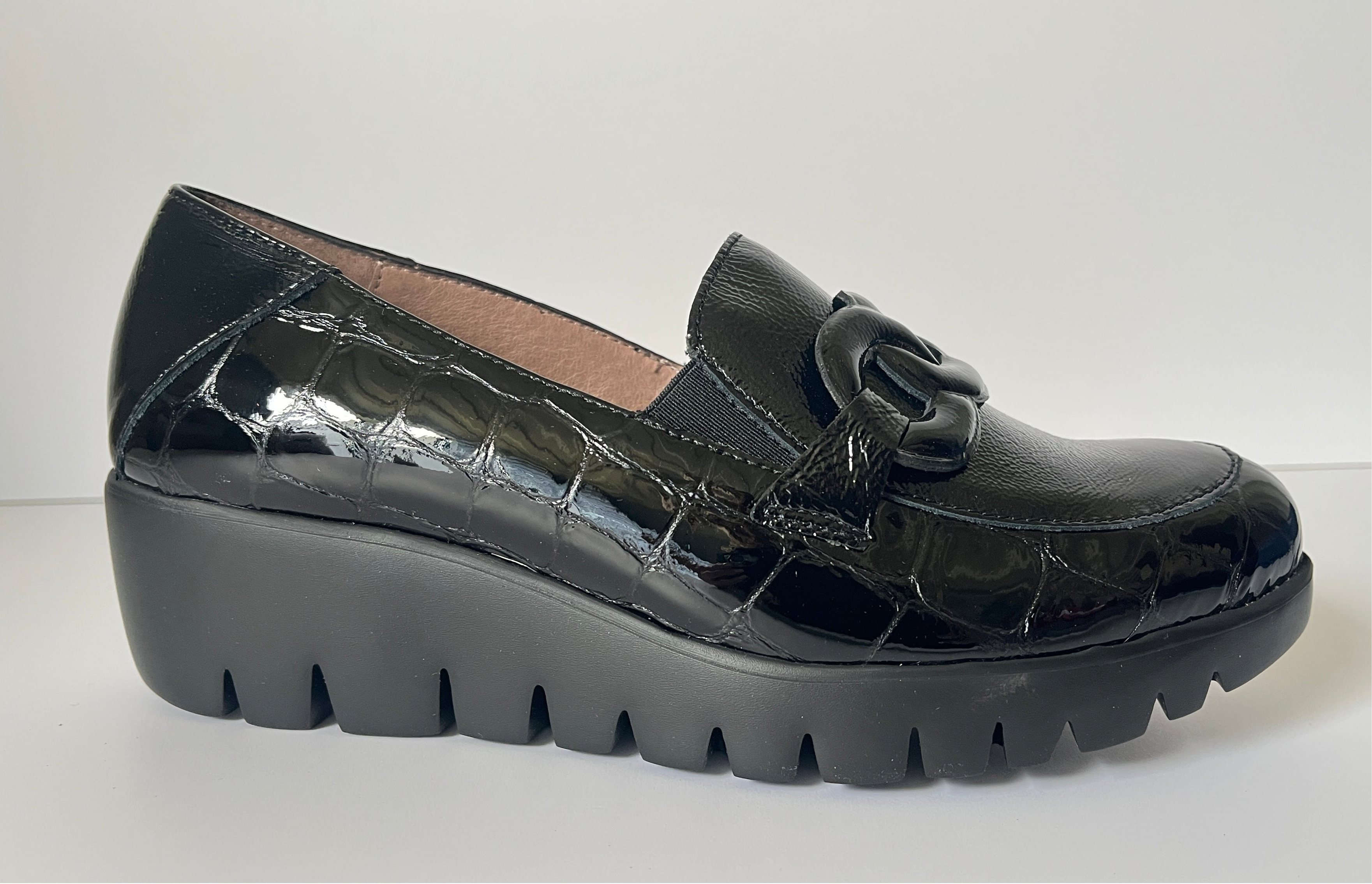 These WONDERS C-33330 Black  Patent Wedges feature a classic design  with a navy buckle. Made with patent leather and leather lining, they are an ideal addition to your wardrobe. With a 40 mm heel, they provide a stylish and elegant boost to any outfit. Made in Spain by WONDERS, these wedges are a must-have for the fashion-forward individual.