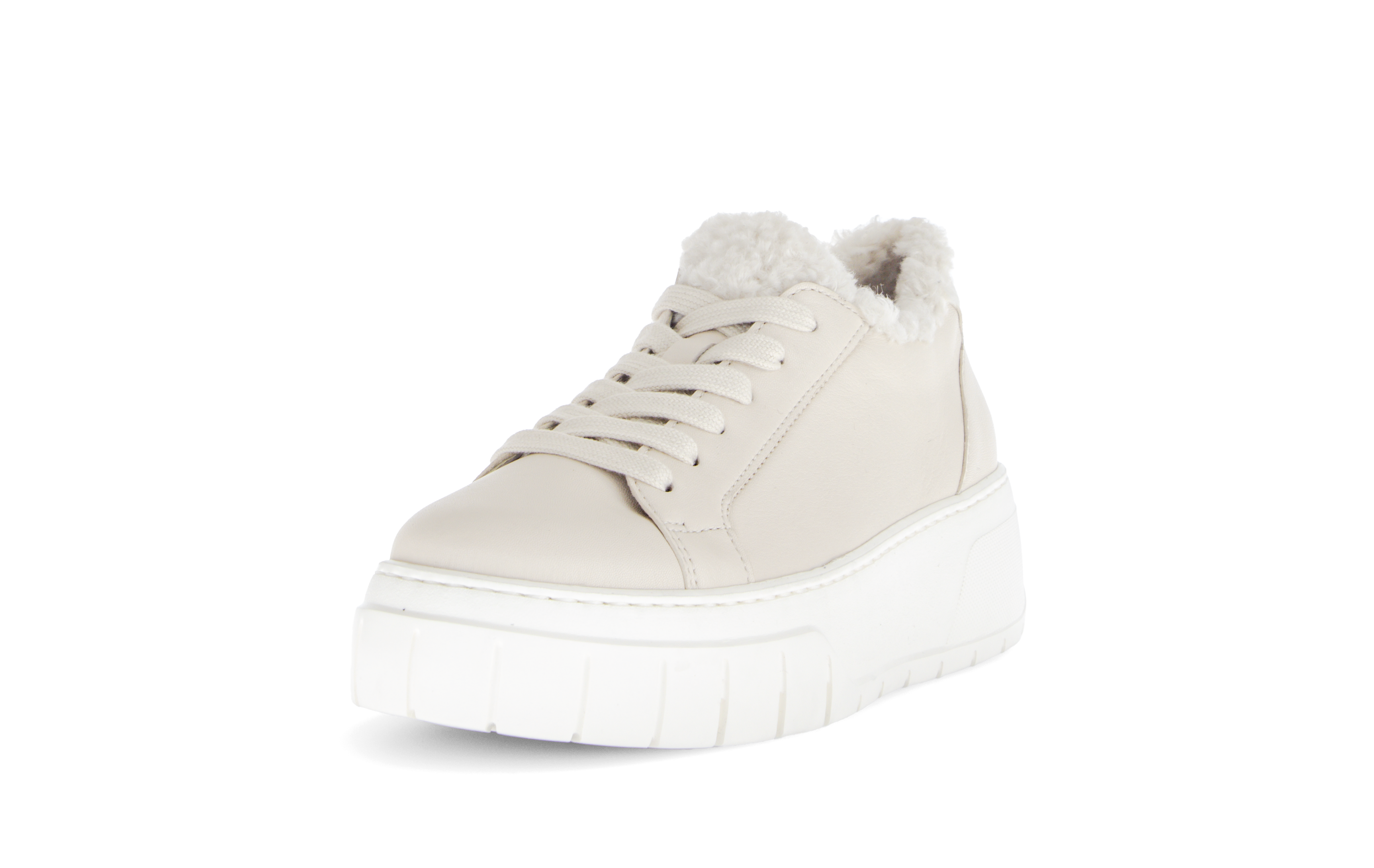 This adaptable trainer seamlessly transitions between casual and polished looks. Made from cream leather, it features a faux fur cuff and matching laces. The wedge heel, approximately 50mm high, combines comfort with contemporary style. Designed with a true-to-size fit and a removable comfort insole, these shoes offer lasting wearability. Crafted in Germany by GABOR, style code 22122, they are an excellent addition to elevate your footwear collection. The upper and lining are both leather, ensuring quality and durability.