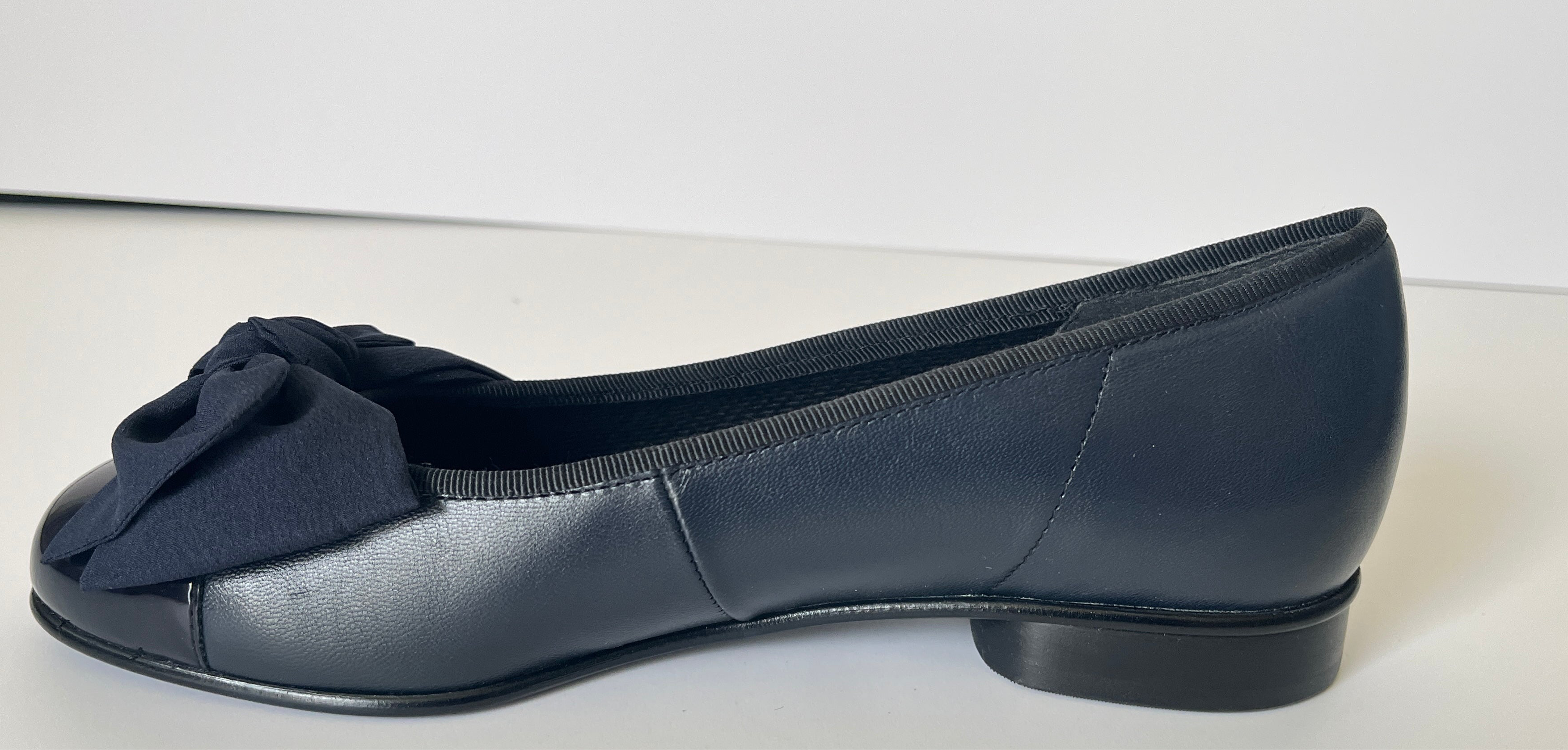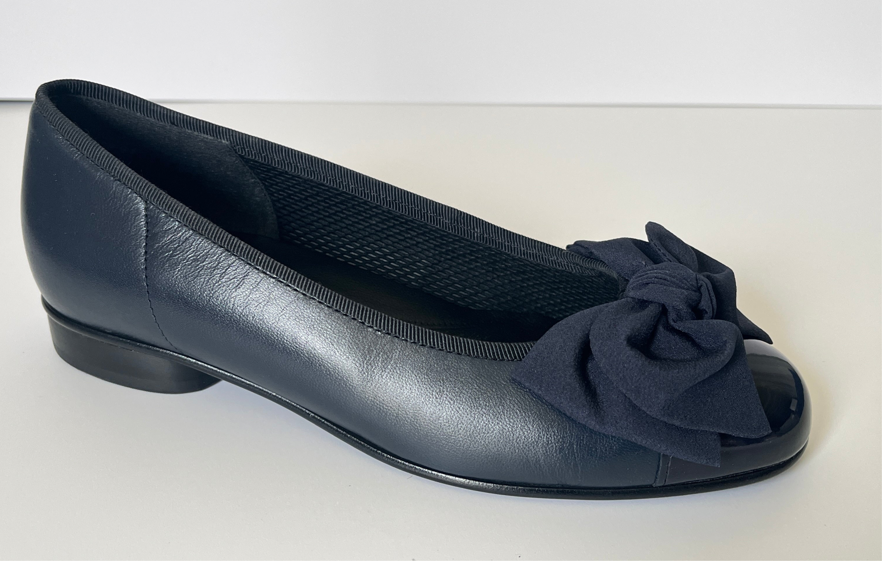 These are a pretty pair of ballet pumps ideal for smart and casual wear. While they are a standard fit we do advise choosing a half size bigger than your normal size for comfort . They are available in highly versatile black or navy leather with fabulous patent toecaps that create a subtle yet stylish contrast. A beautiful bow adorns the toe adding a feminine flare to any outfit. A 2cm  heel adds a lady-like arch to the foot while resin rubber soles provide a practical and hardwearing grip.