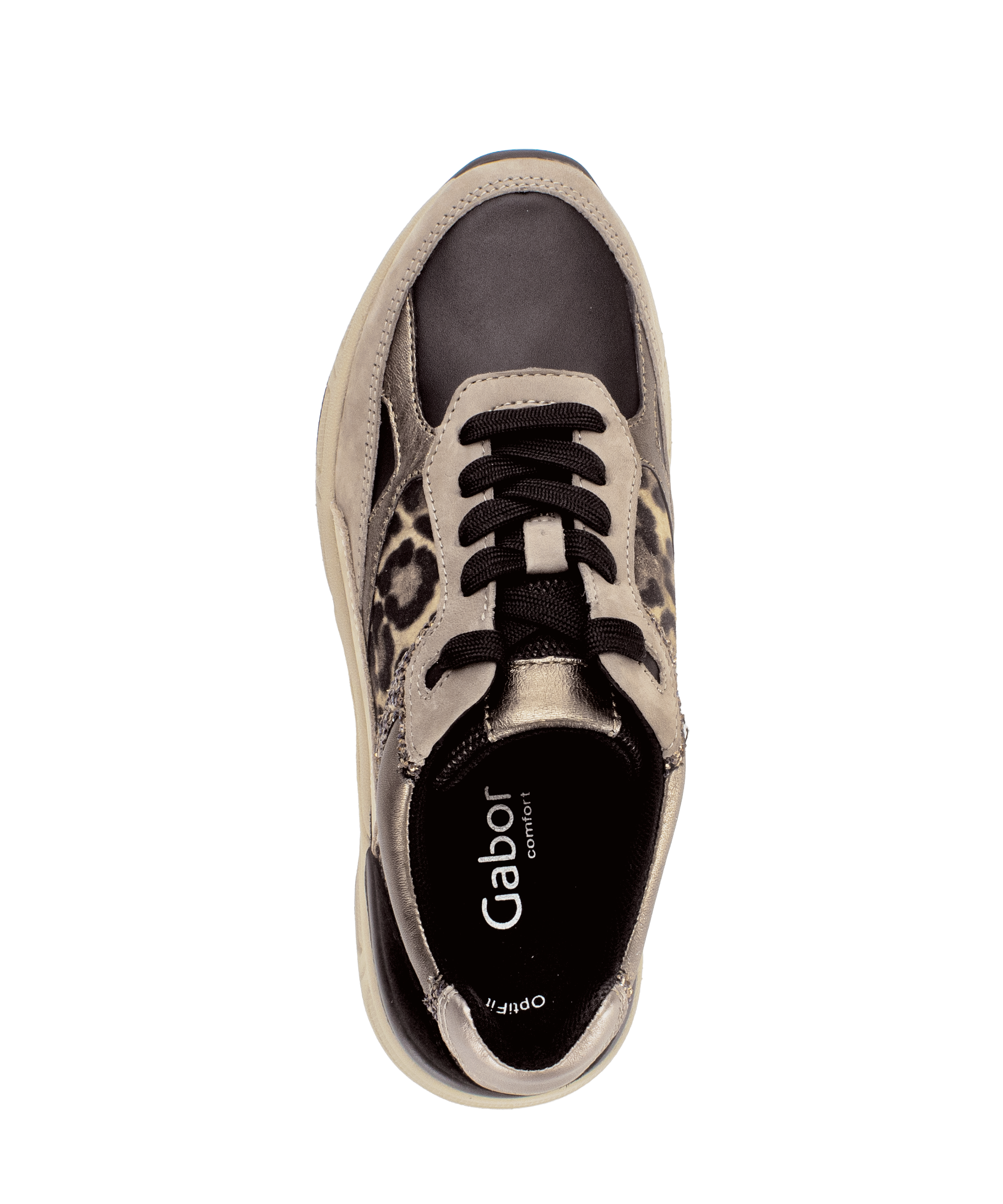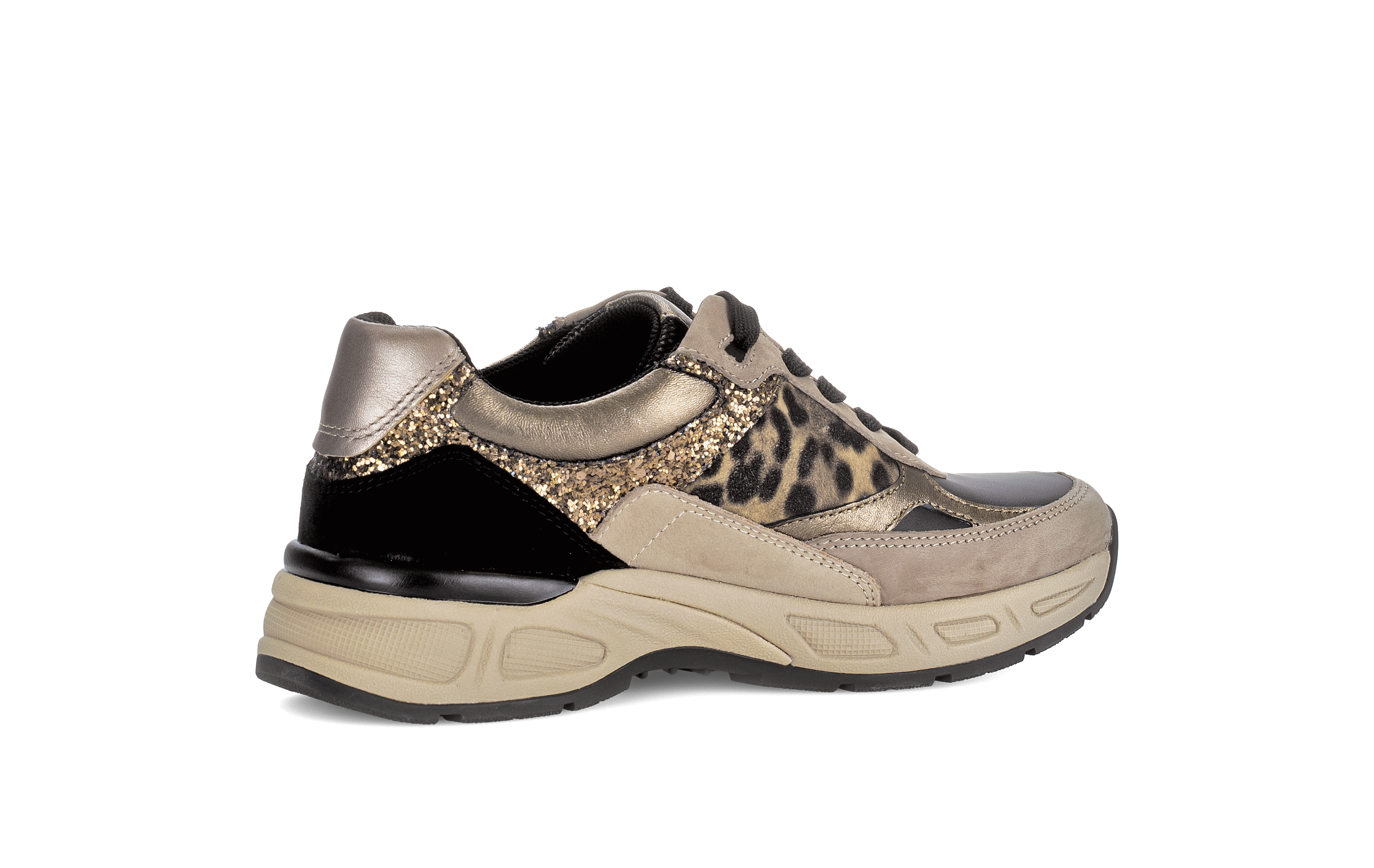 The Gabor Taupe Leopard Trainer 58544 is a sporty yet stylish trainer with added sparkle .It's designed on a rubber sole, delivering both elegance and all-day comfort. Removable insole.