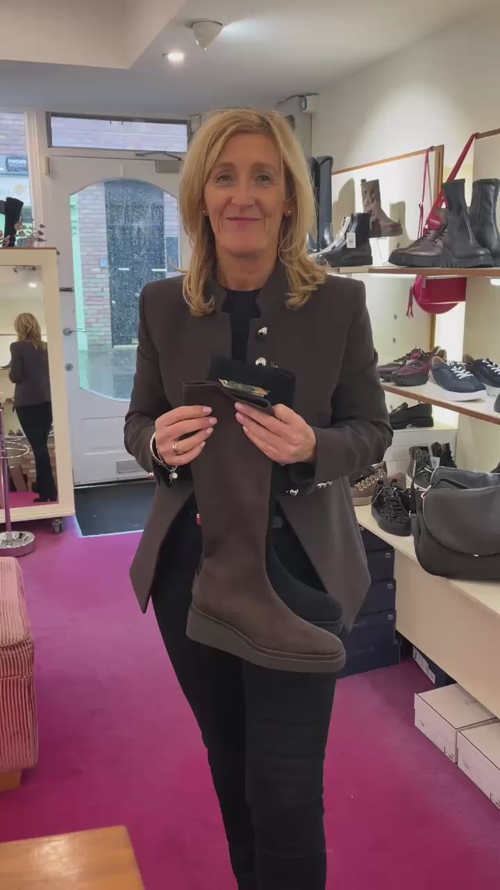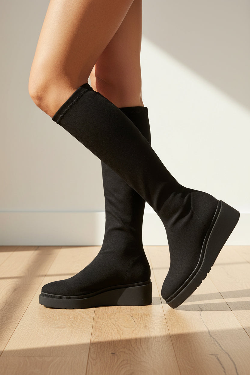 MISS ELASTIC Black Faux Suede Stretch Low Wedge Knee Boot Style: 77360 Upper: Stretch Suede Lining: Textile Sole: Manmade Heel Height: 4.5 cm. Made in Spain Experience superior comfort and style with the Miss Elastic stretch sock boot. Made from eco-friendly, water-repellent suede, these boots are built to handle changing weather conditions. The breathable, antibacterial SaniTex lining maintains freshness while the padded anti-pressure insole provides lasting cushioning for all-day wear.