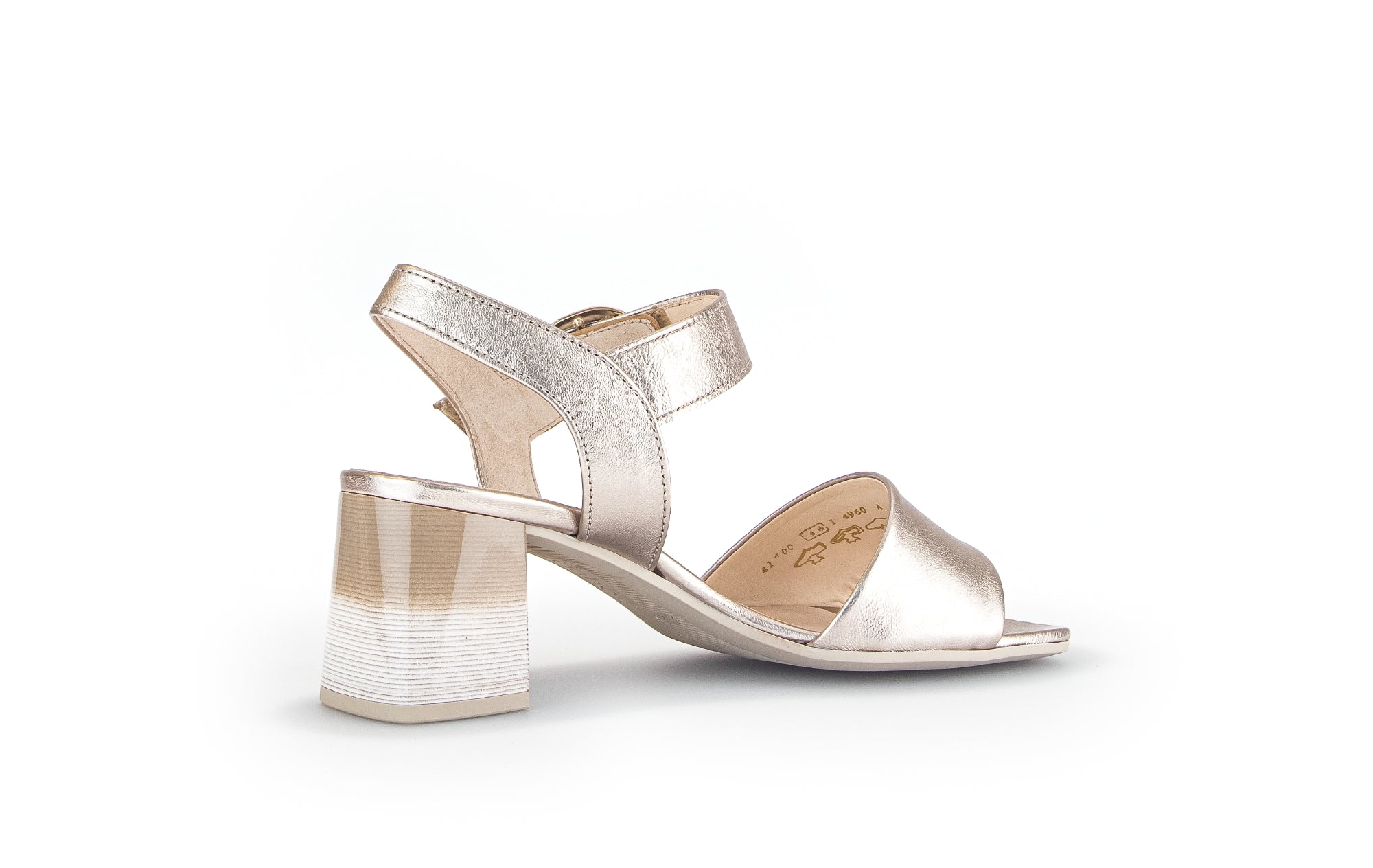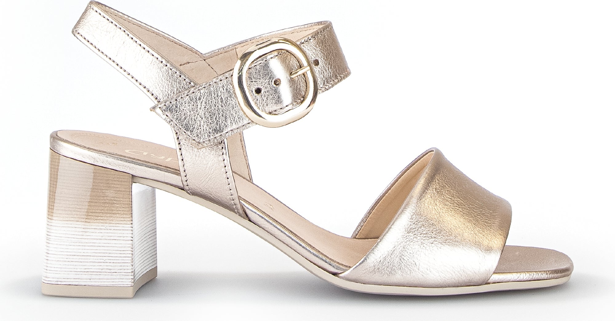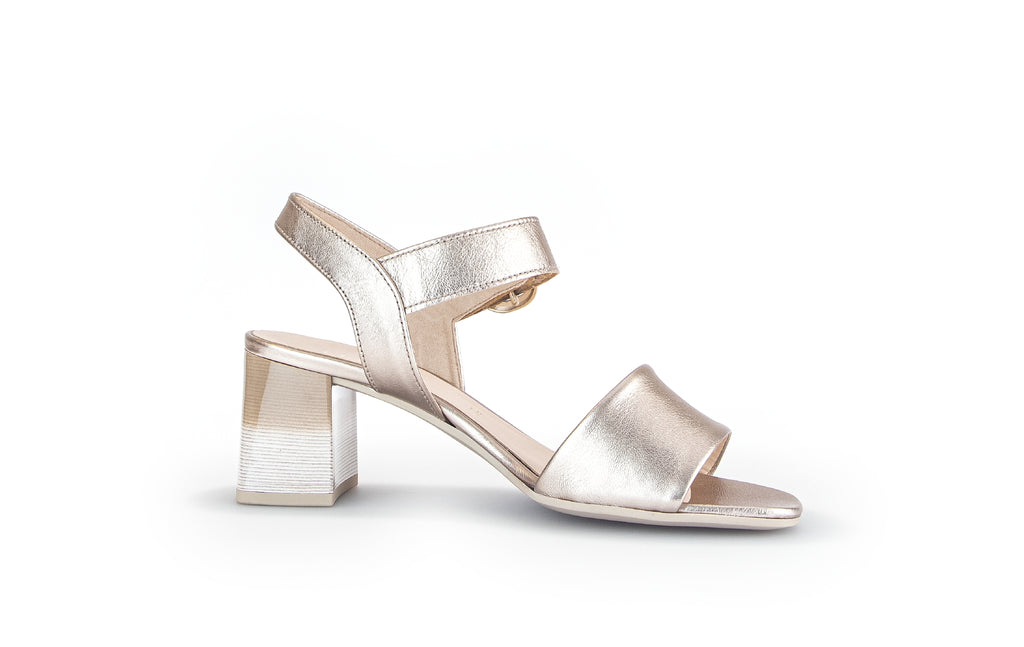 This sandal features a block heel and is made of pale gold leather. The velcro strap at the ankle has an adjustable buckle detail. The upper, lining, and sole are made of leather, with a heel height of 5.5 cm. This sandal is a standard fit and style 70062 by GABOR, made in Germany.