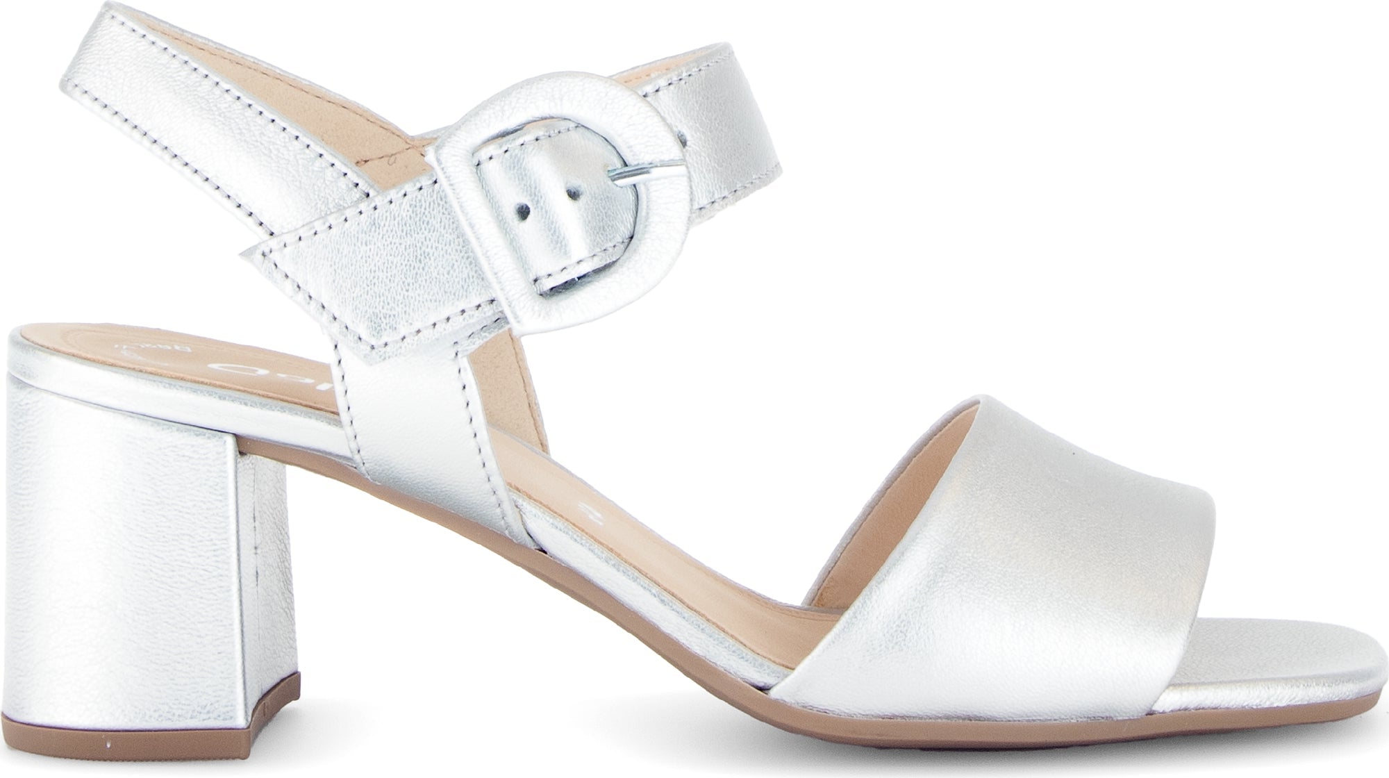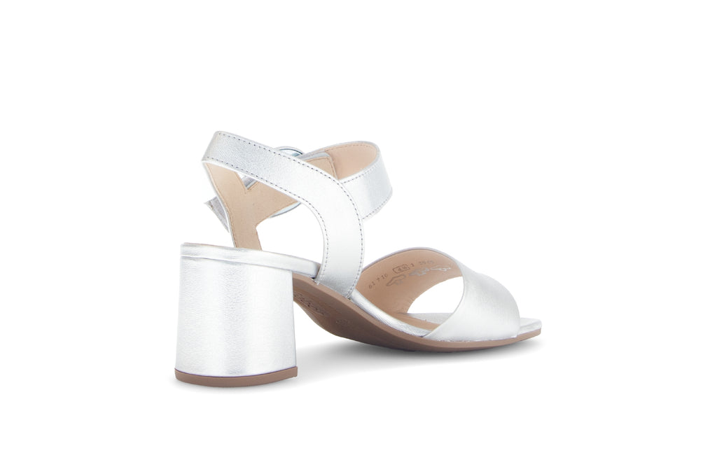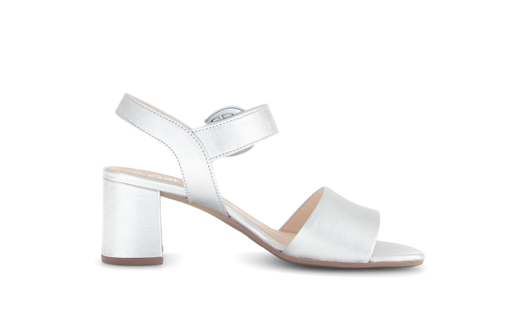 The GABOR Silver Block Heel Sandal 71061 is a must-have addition to any summer wardrobe. Made with luxurious soft leather, this sandal offers a perfect transition from day to night. It features a velcro strap with an adjustable buckle detail at the ankle and boasts a standard fit with a 5.5 cm heel height. Crafted in Germany, this sandal exudes quality and style.