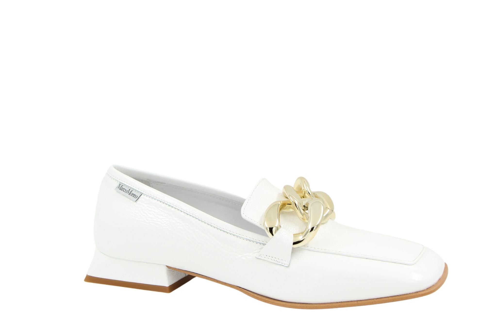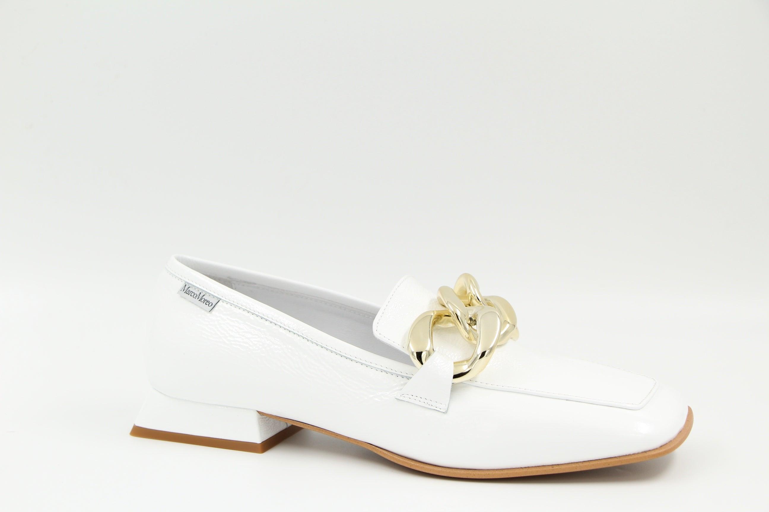 Looking for a classic Summer loafer? Marco Moreo's loafer in white patent with stunning, gold buckle detailing will be such an addition to your Summer wardrobe .These are a classic Italian style that you'll wear endlessly with jeans, denim or white and cropped or cigarette cut trousers .