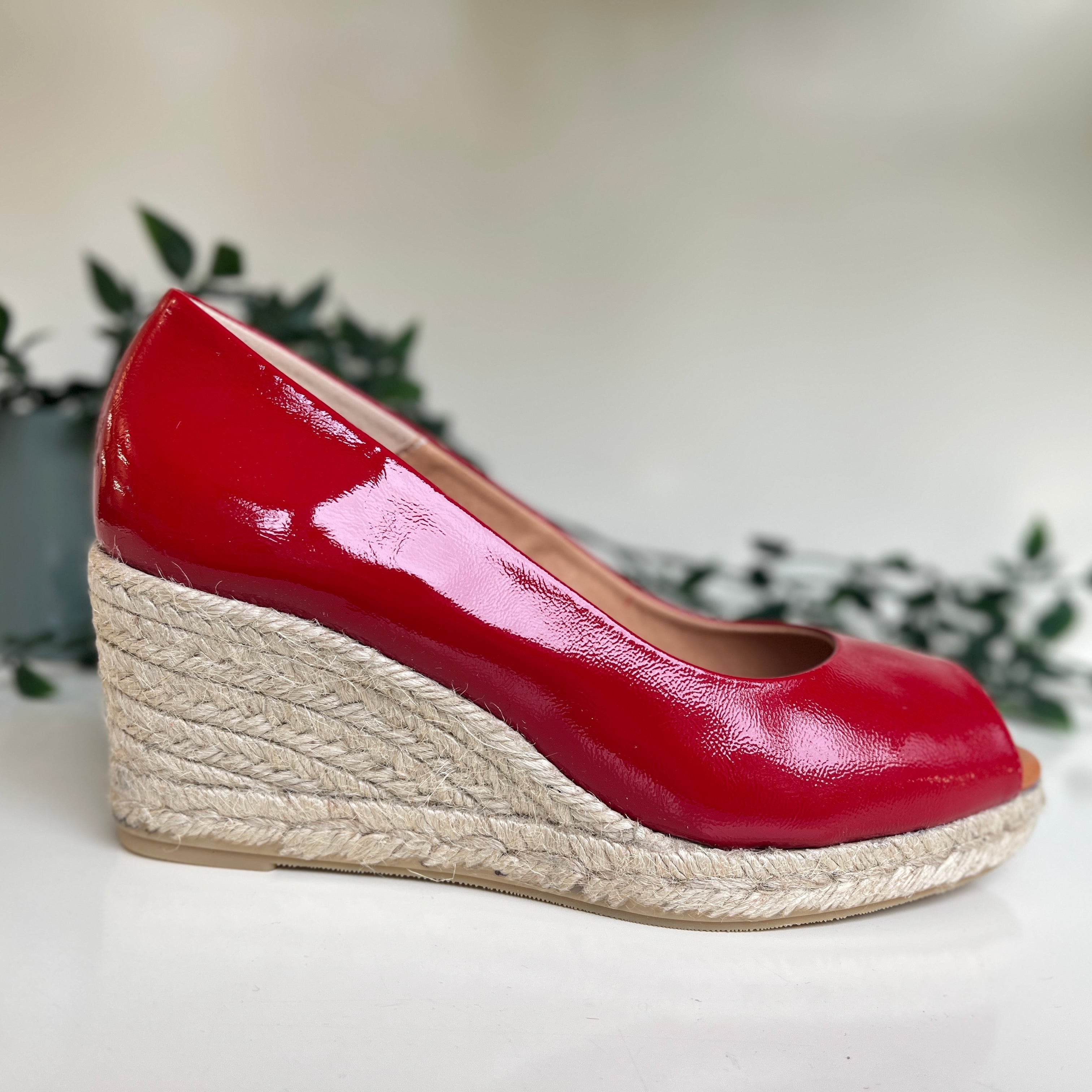 Add a vibrant flair to your wardrobe with the MARIAN Red Patent Peep Toe Wedge Espadrille. Crafted with a patent leather upper and leather lining, this shoe features a 70 mm heel for comfortable elevation. Designed to fit true to size, the Marian combines expert craftsmanship from Spain with stylish appeal.