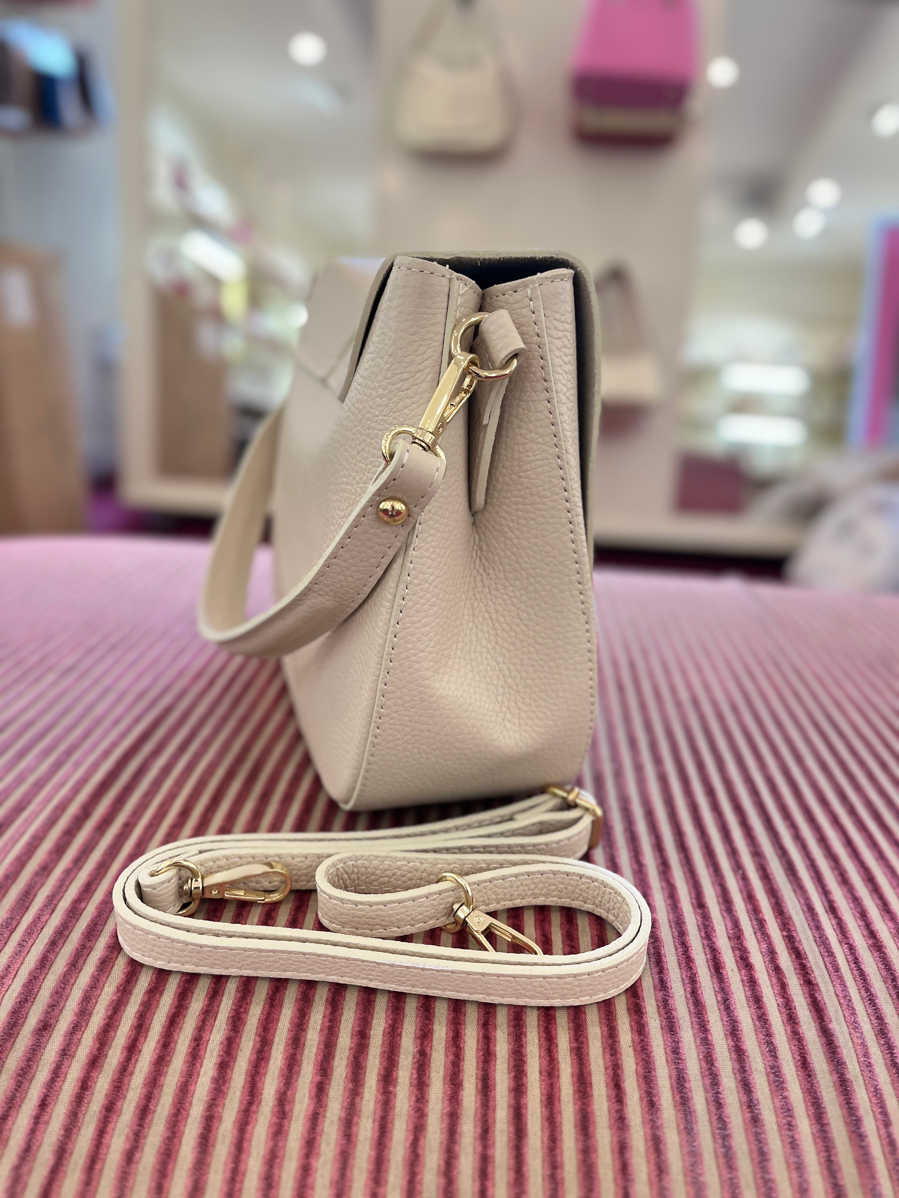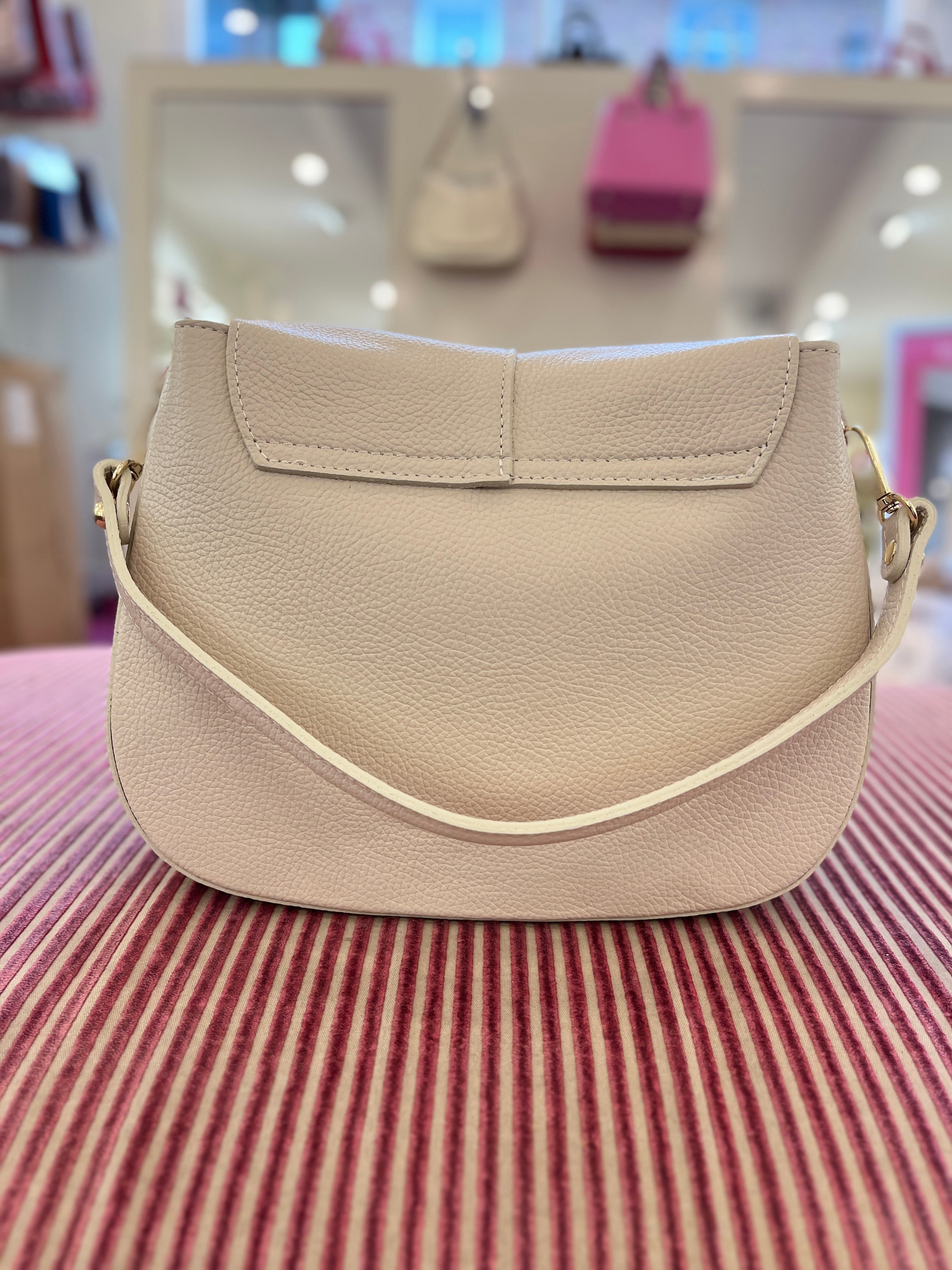This MARCO MOREO Off White Leather Saddle Bag 1816 boasts a leather exterior and a fabric and leather interior. Its dimensions are W 25 l 21 D 9 cm, and it features a short leather shoulder strap and an adjustable leather crossbody strap. With two compartments and an interior zip pocket, this handbag is expertly crafted in Italy by MARCO MOREO.