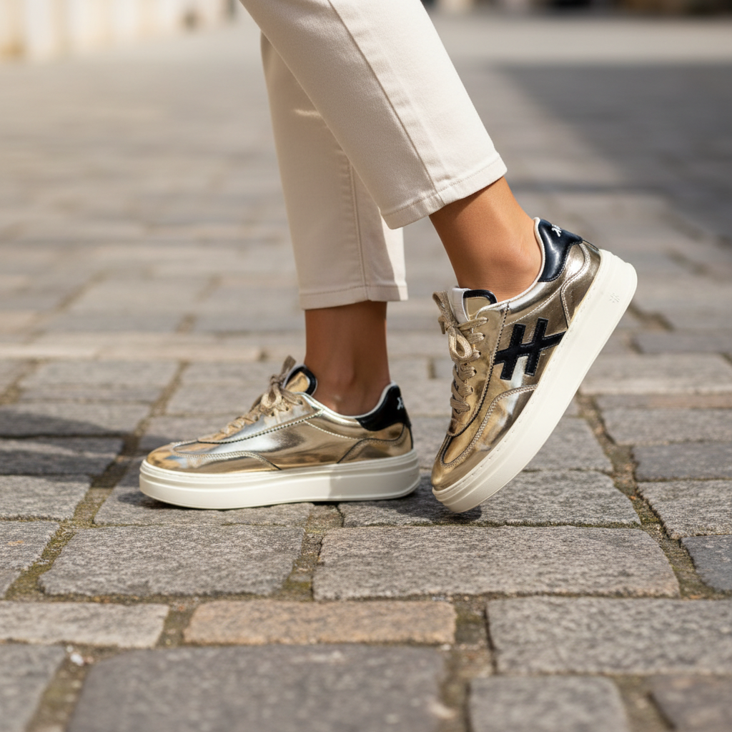 Engineered for impact, this ANOTHER TREND platform trainer merges Spanish heritage craftsmanship with bold contemporary styling. The gold and black colorway commands attention, while the roomy fit adapts to diverse foot shapes. Premium leather construction—upper and lining—ensures lasting wear and natural ventilation. The 40mm heel and 30mm platform foundation deliver dramatic elevation without compromising wearability, anchored by a responsive, lightweight sole. Style A035 exemplifies the brand's dedication to refined construction and modern design language.