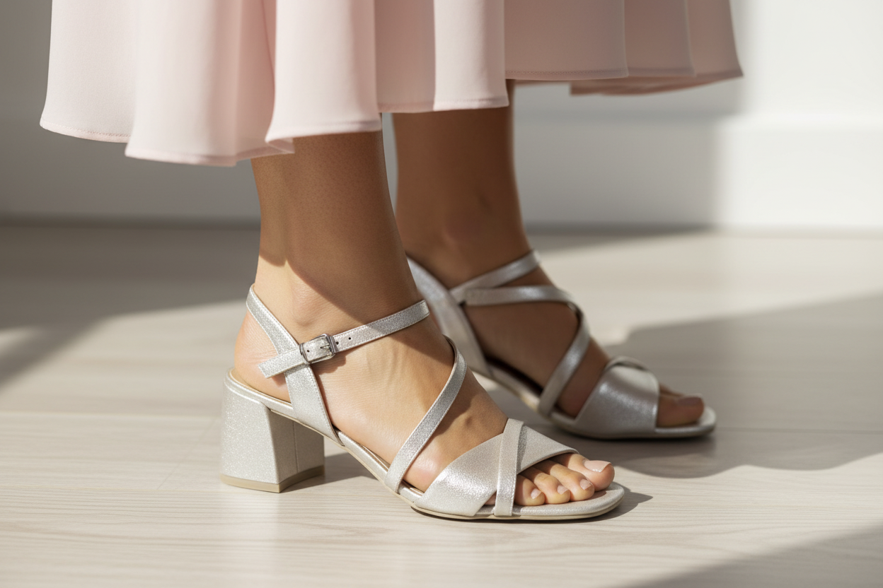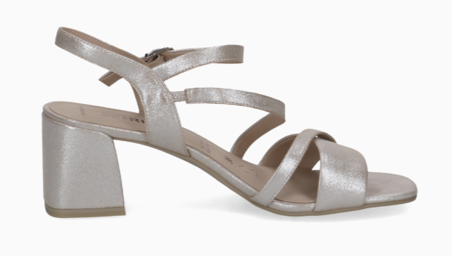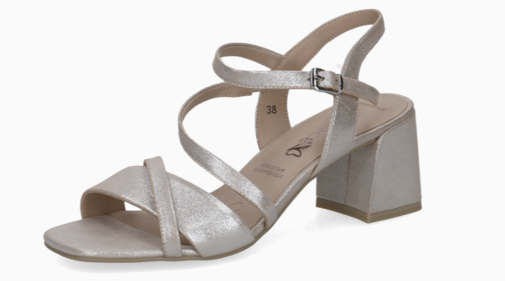 This CAPRICE silver shimmer sandal combines understated sophistication with everyday wearability. Constructed with a leather upper and lining for breathability and comfort, it features a durable manmade sole and a modest 65mm heel. The generous G-width fit ensures a secure, comfortable stride for those seeking roomier proportions. Silver Shimmer Sandal Upper Leather Lining Leather Sole Manmade Heel Height 65mm Fit G Fit Wider Fit