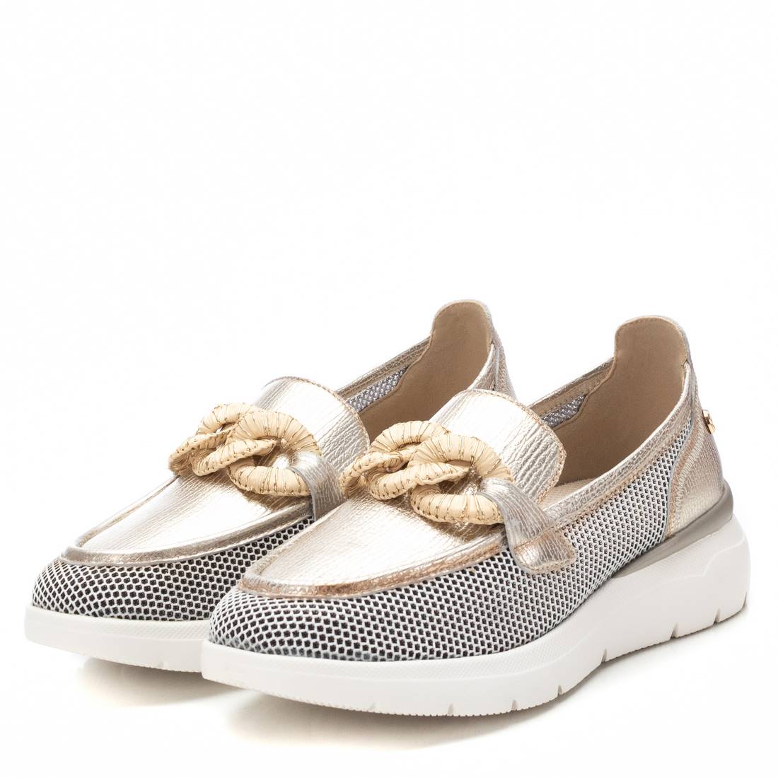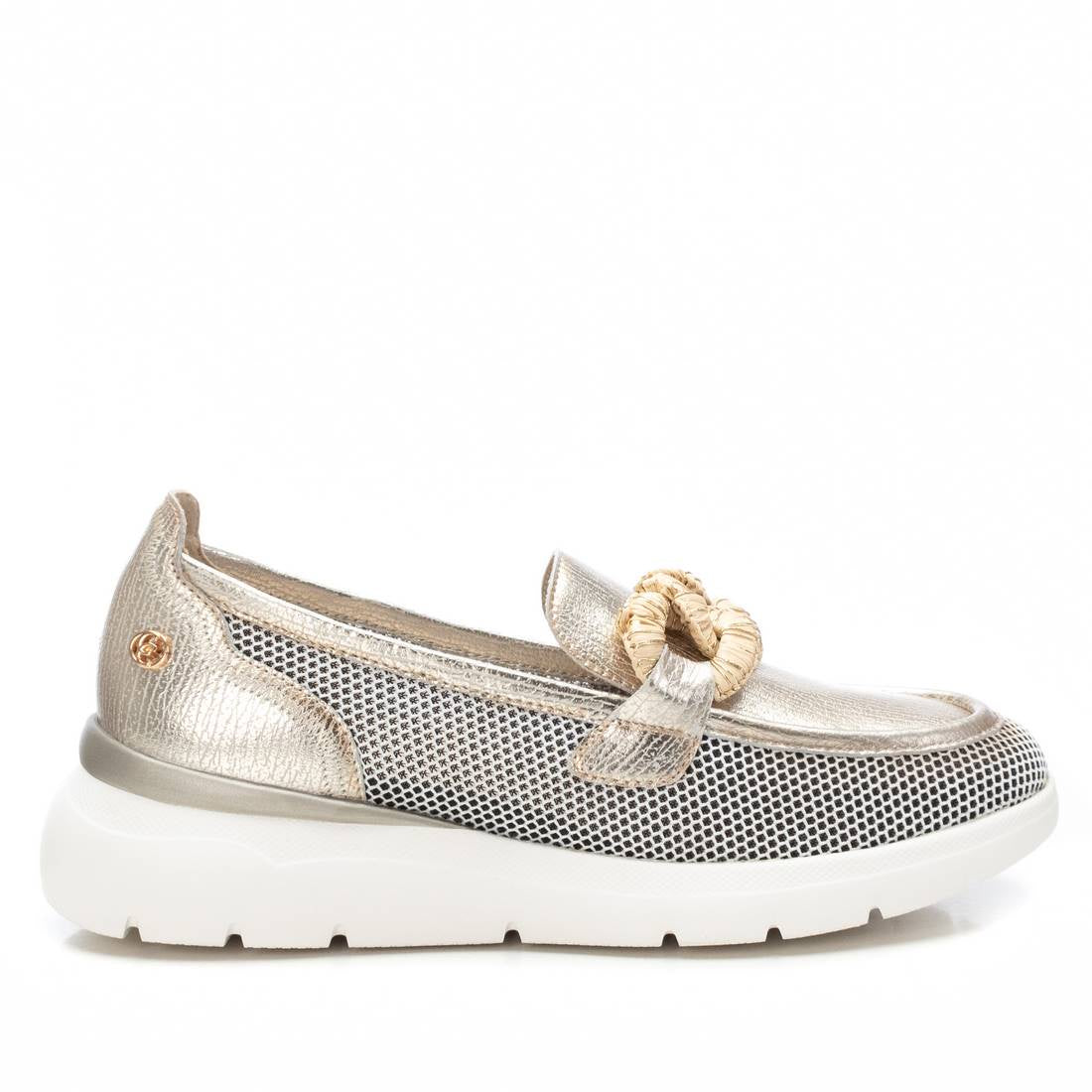 The CARMELA Gold Wedge Loafer features a leather upper and lining, complemented by a textile and manmade sole. It offers a comfortable 4 cm (1.5 inch) heel height and is expertly crafted in Spain.
