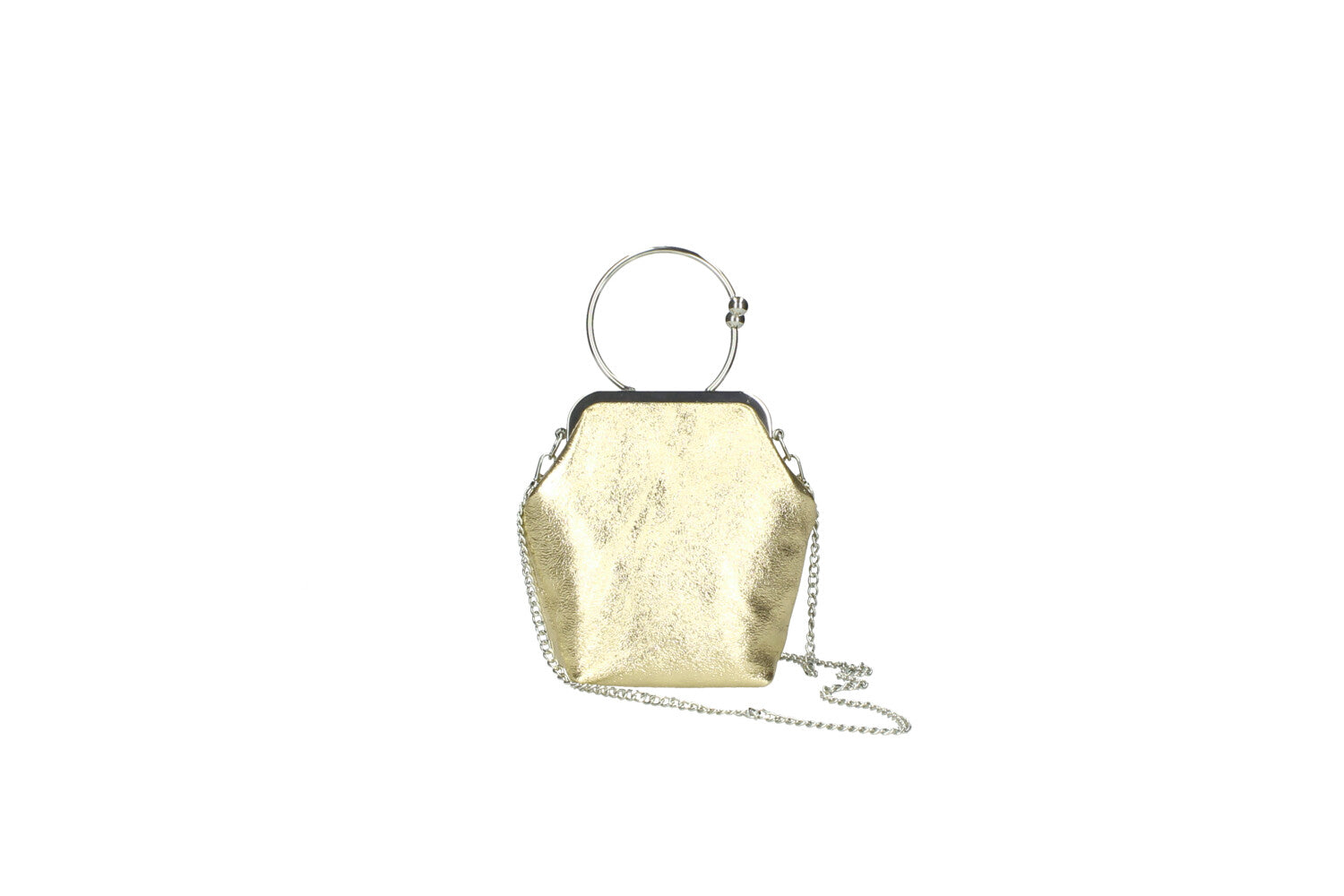 Fabucci Gold Leather Purse Style Bag This spacious bag, designed for special occasions, features a circular clasp and a detachable chain strap, allowing it to be carried by hand or worn over the shoulder. Dimensions: 13 x 19 x 7 cm. Hardware: Silver. Crafted in Italy.