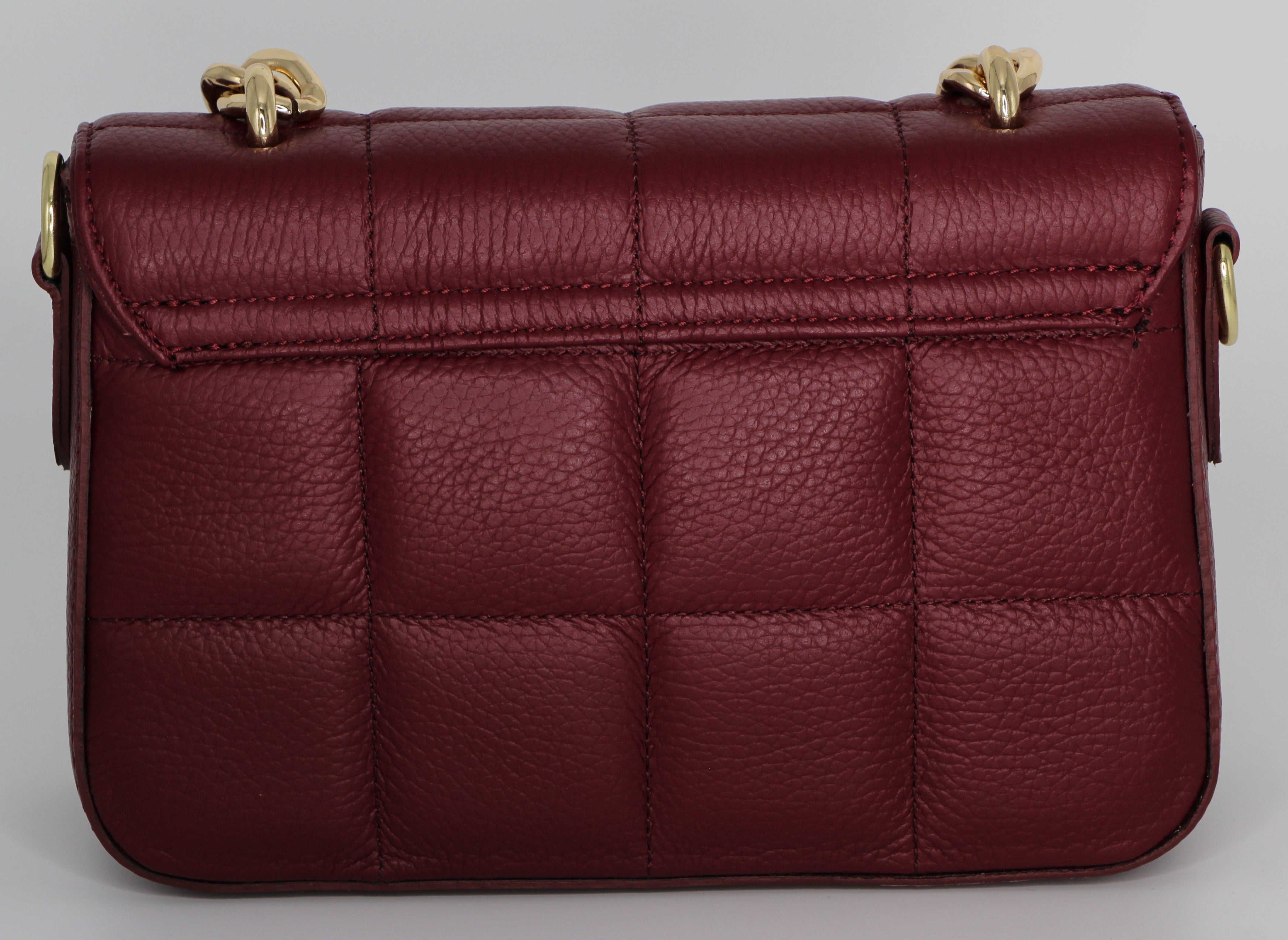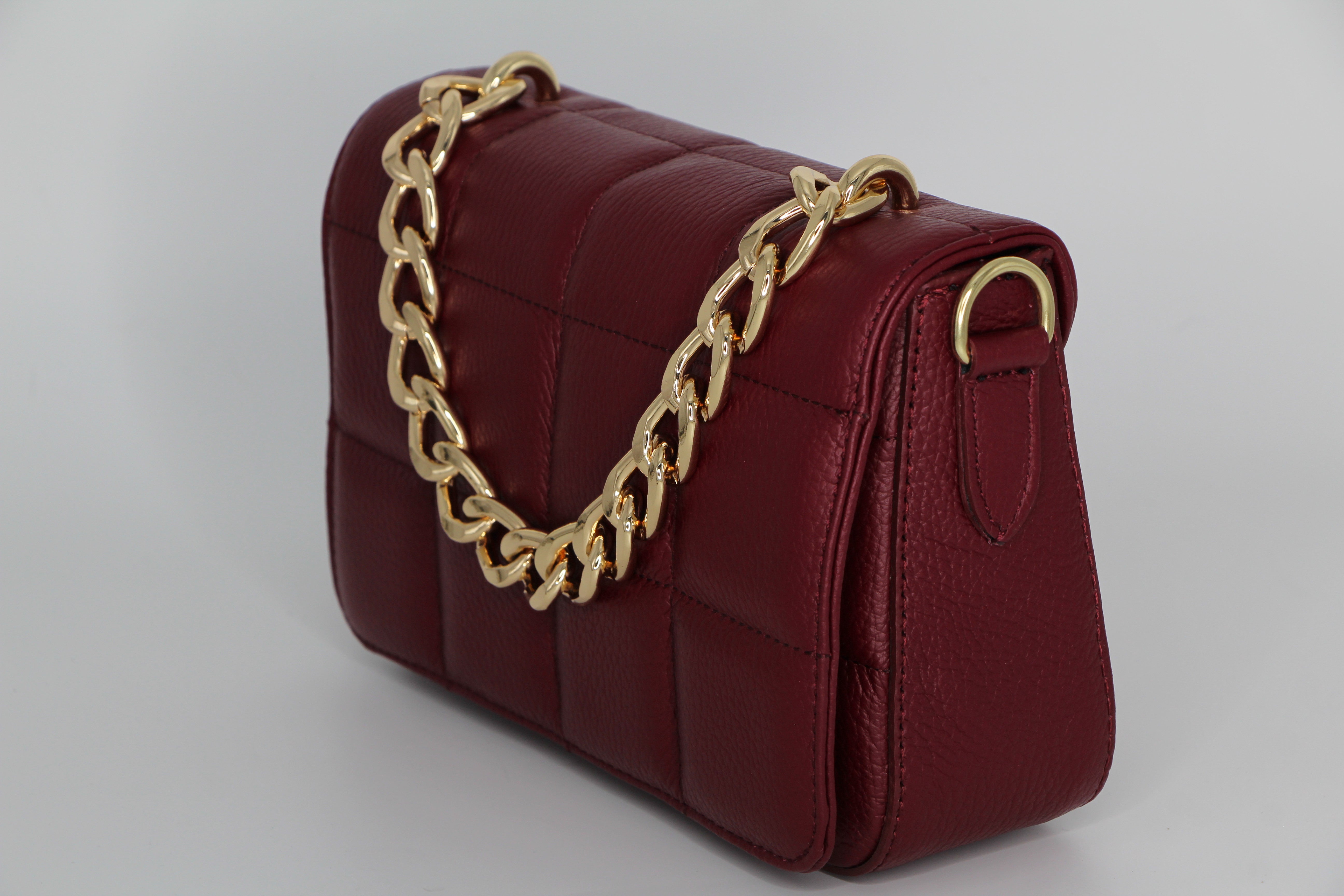 The Fabucci Burgundy Quilted Leather Handbag MIMI features a flap and zip closure, highlighted by a gold chain detail. This leather handbag includes a single compartment with an interior zip pocket and comes with a shoulder strap for versatile wear.