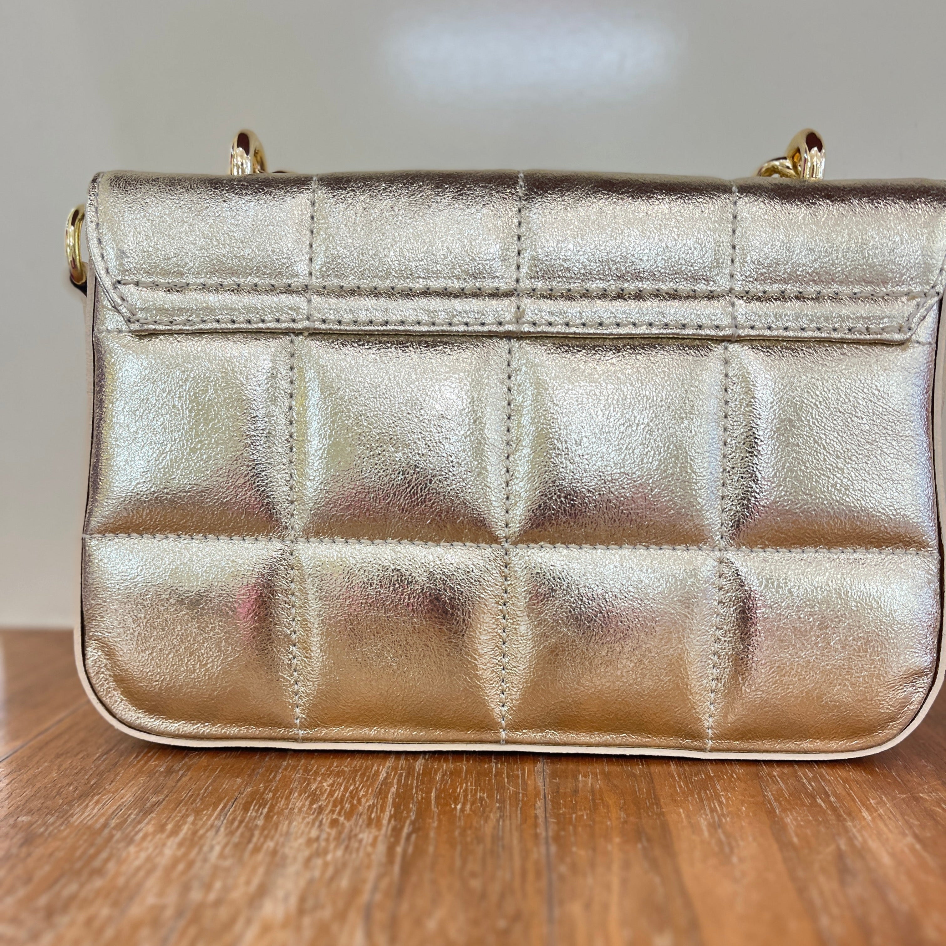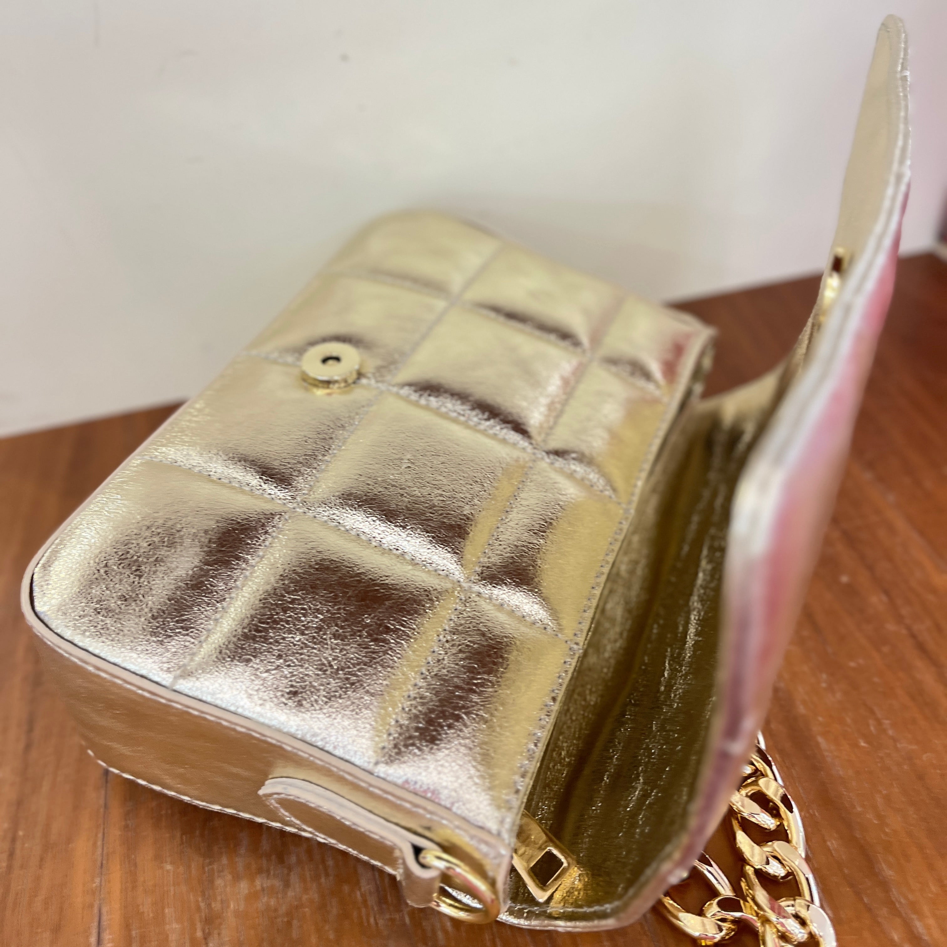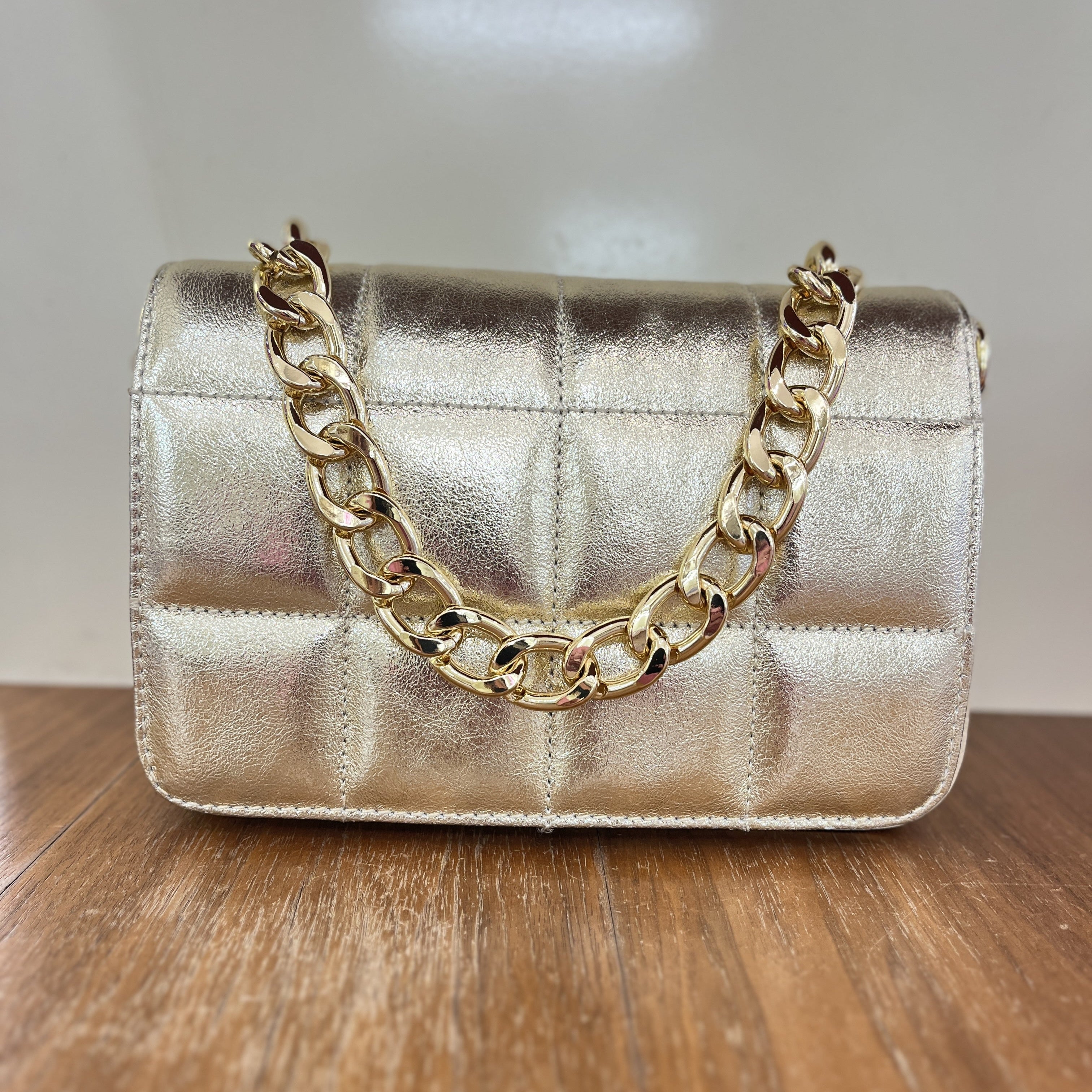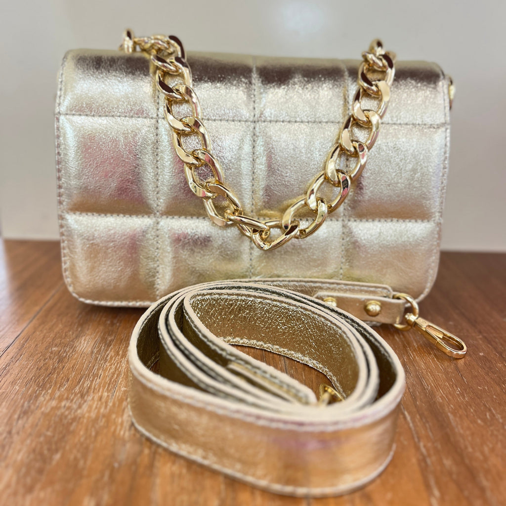 A soft grained gold leather  handbag. This handbag comes with one centre zip and an interior  zip pocket. It has an adjustable/detachable  leather strap that can be worn on the shoulder or crossbody and a gold chain strap