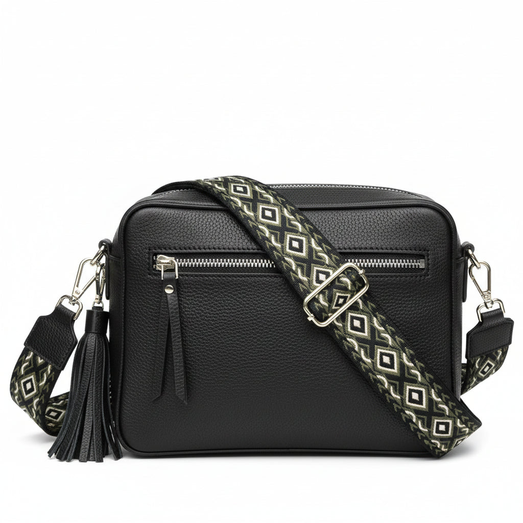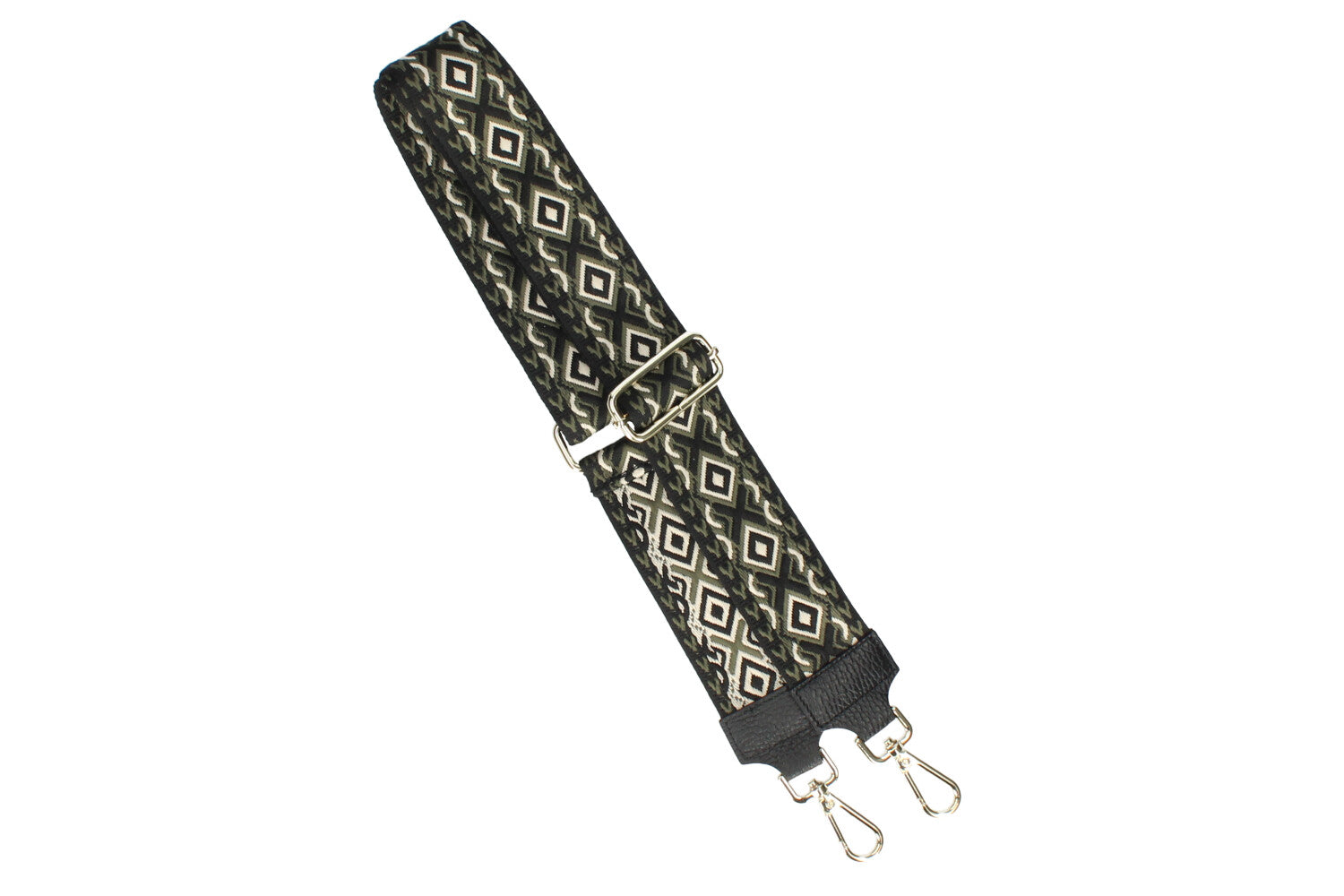 Elevate your accessory collection with this sophisticated Fabucci handbag strap, where premium craftsmanship meets versatile design. The rich black foundation is complemented by khaki green and cream textured details, while gleaming gold-tone hardware provides a touch of refined sophistication. Constructed from durable polyester and genuine leather, this strap combines longevity with aesthetic appeal. Measuring 125cm with complete adjustability, it transitions effortlessly between crossbody, shoulder, and hand-carry styles to suit your lifestyle. An essential piece that seamlessly merges practical functionality with contemporary fashion sensibility.