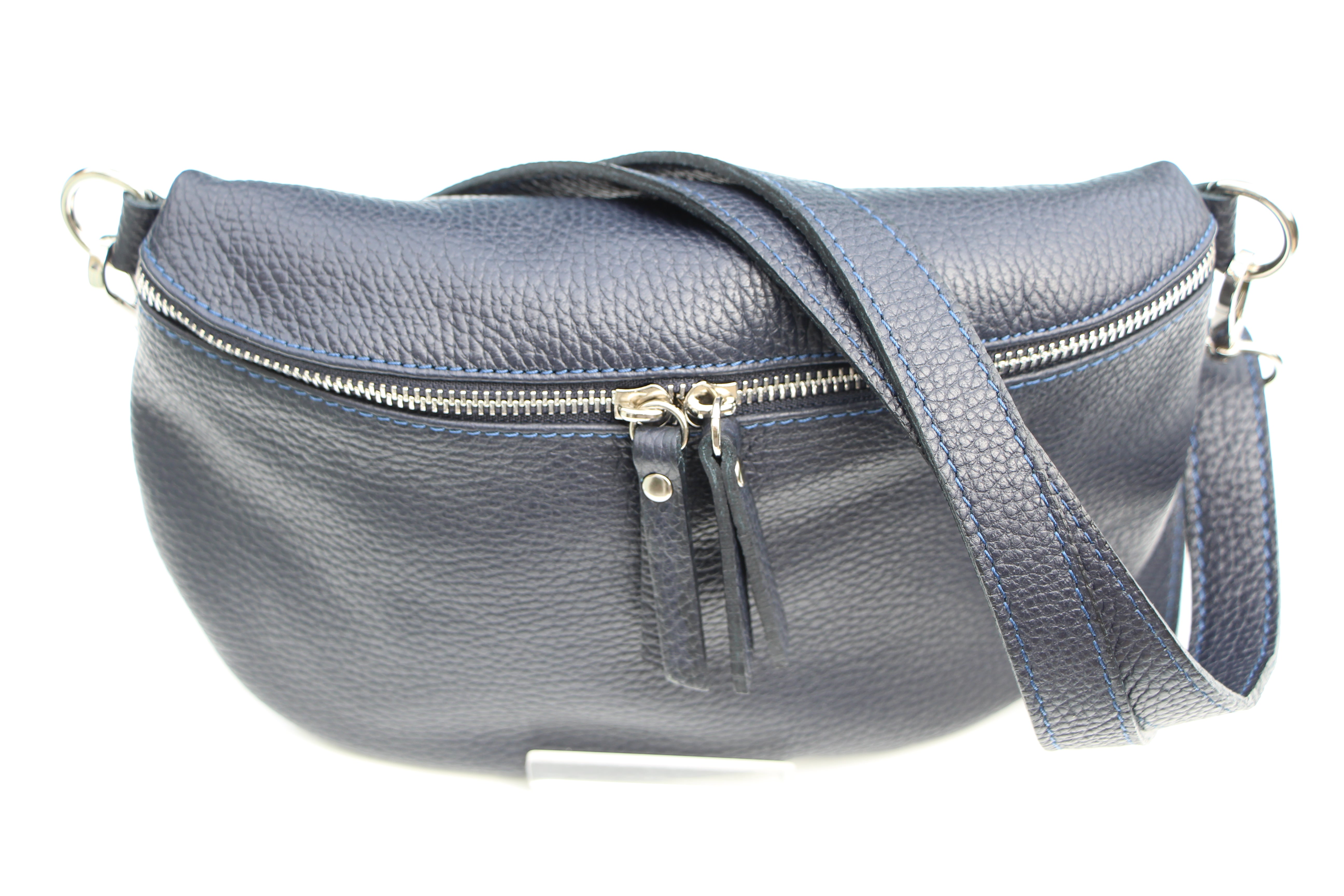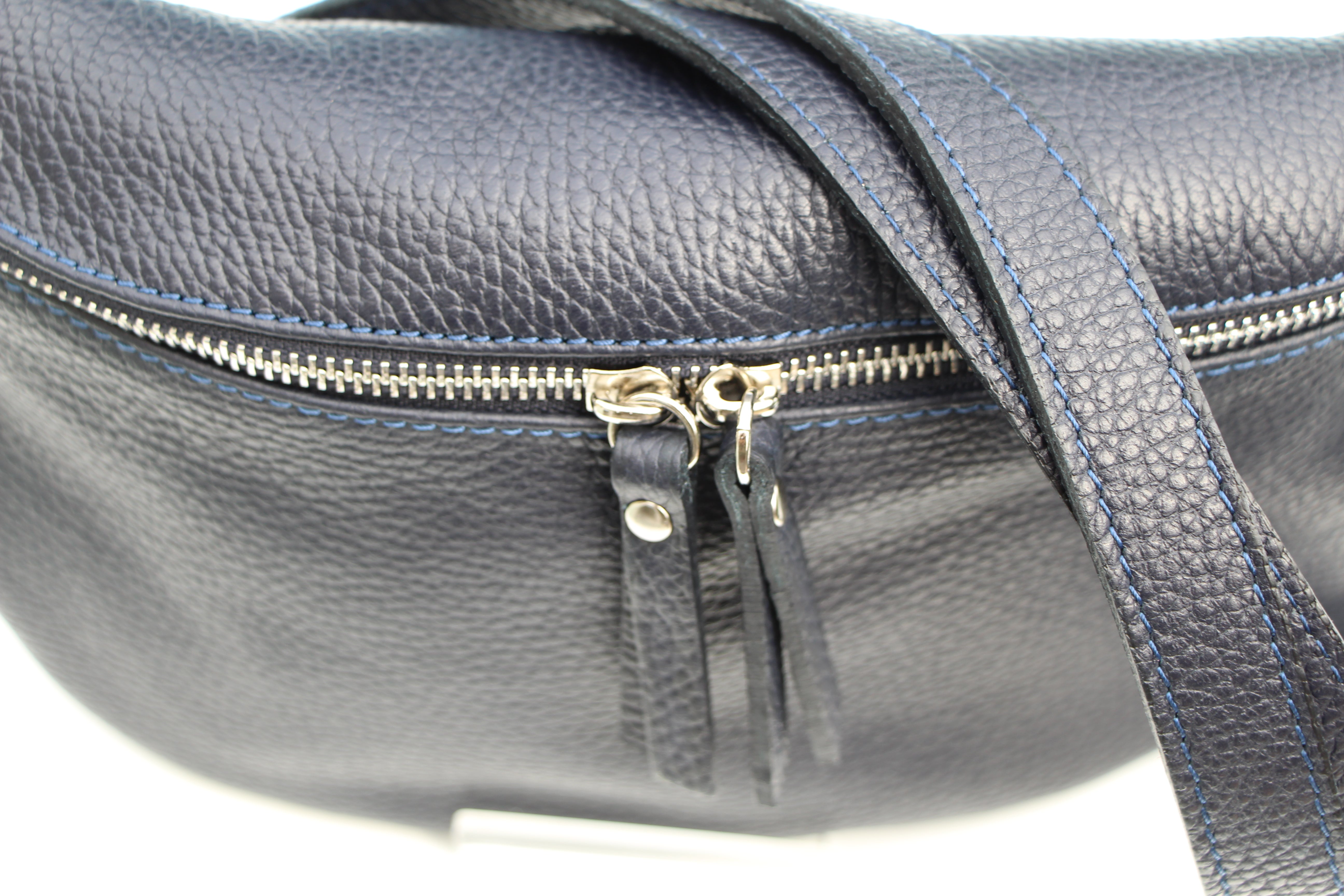 Ladies' navy grained leather soft bum bag. Lightweight with an adjustable strap it can be worn crossbody or on the shoulder. It's perfect for travel, and walking the dog and fits all your essentials: phone, keys & lipstick.