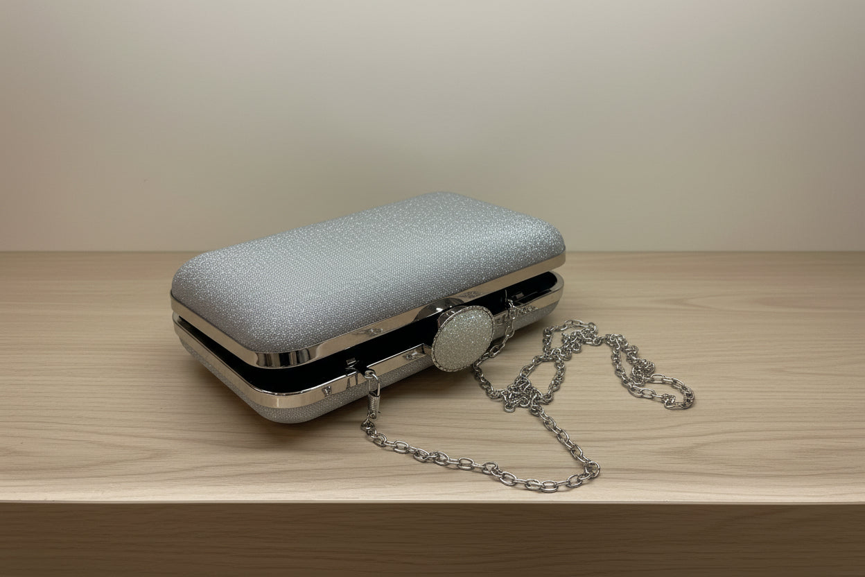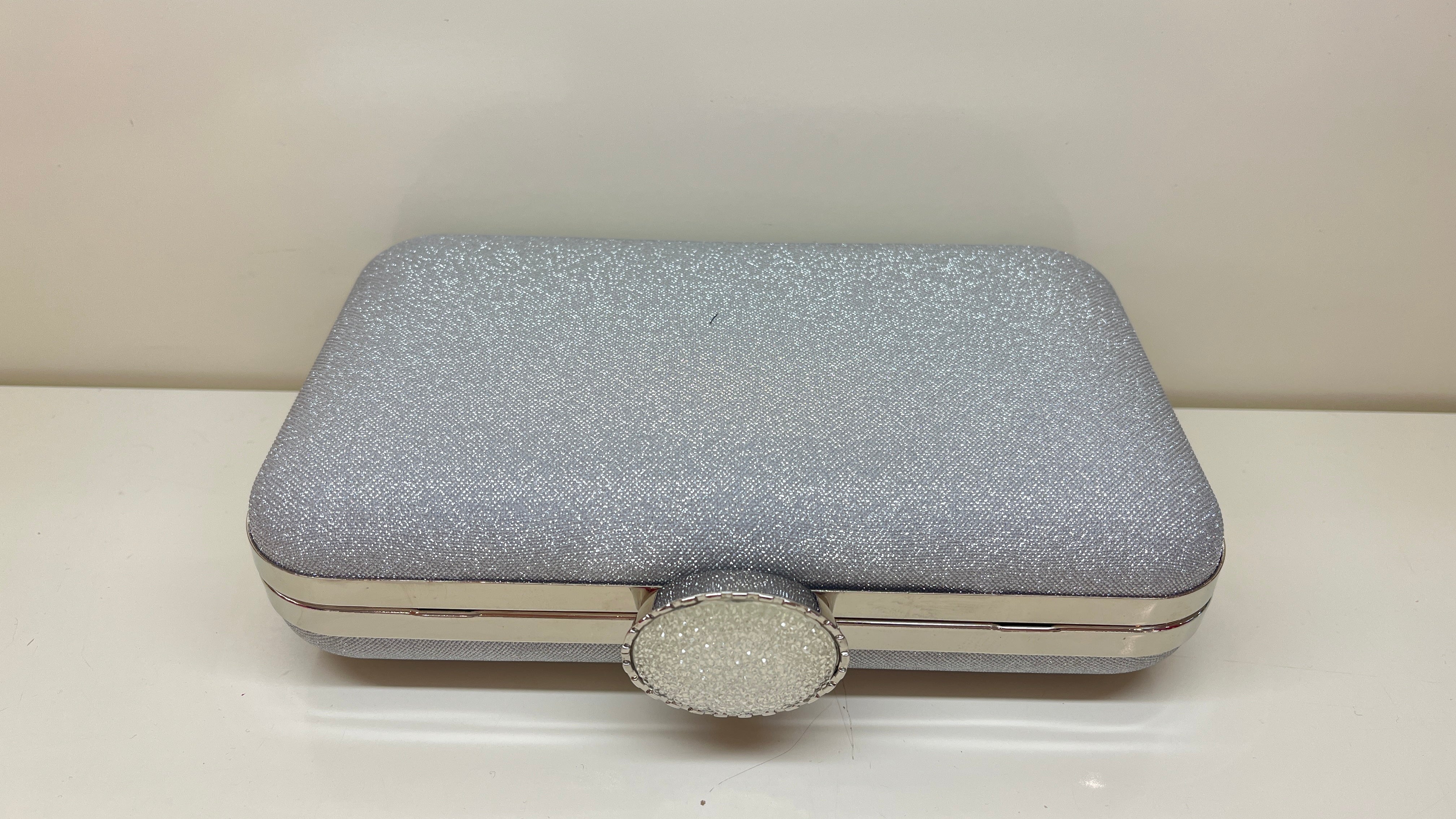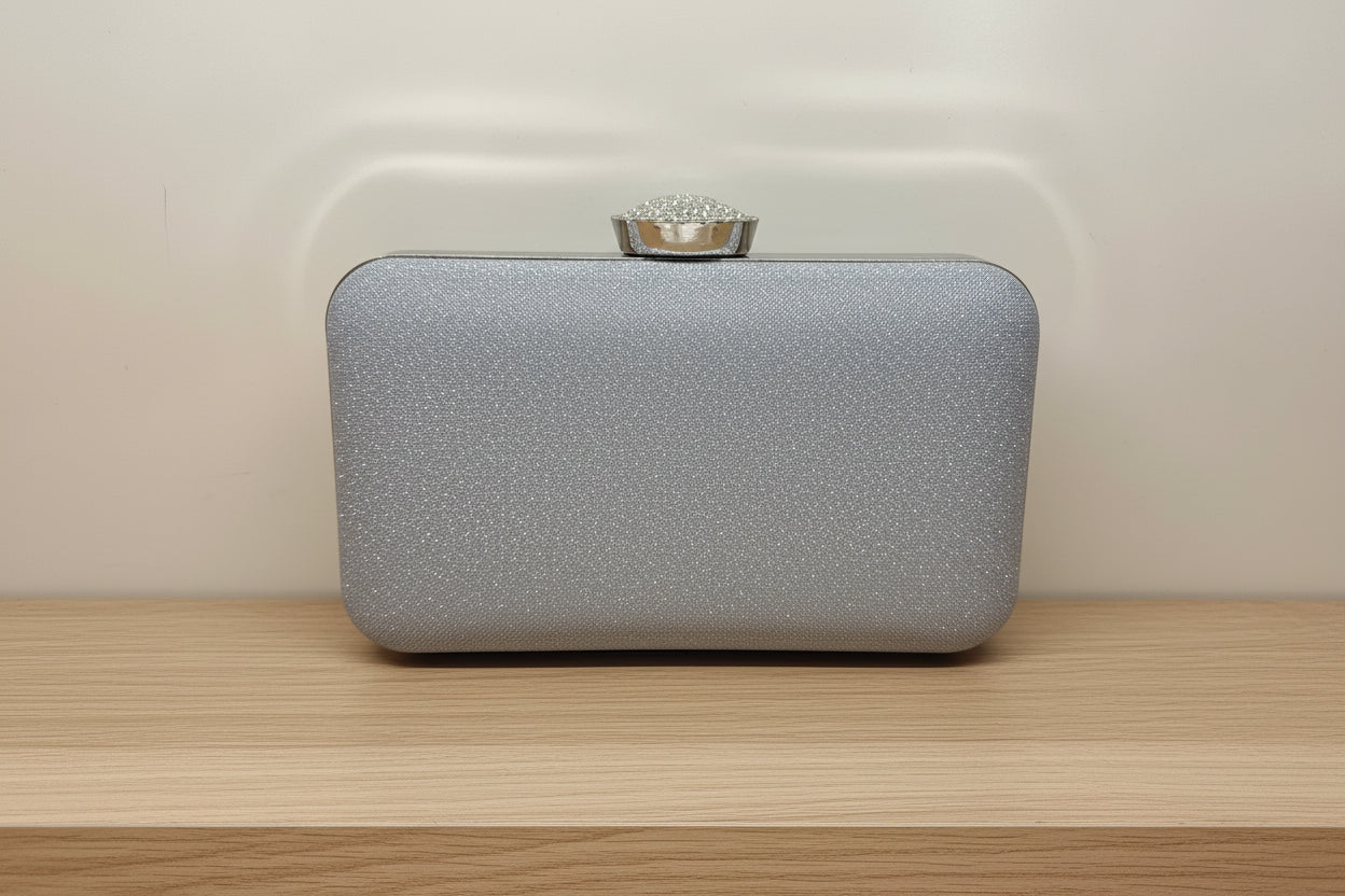 Fabucci Silver Shimmer Box Clutch Bag . This spacious bag, designed for special occasions, features a circular clasp and a detachable chain strap, allowing it to be carried by hand or worn over the shoulder. Dimensions:  19 x10 x  3 cm. Hardware: Silver
