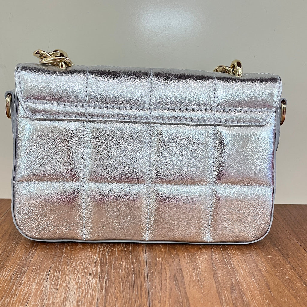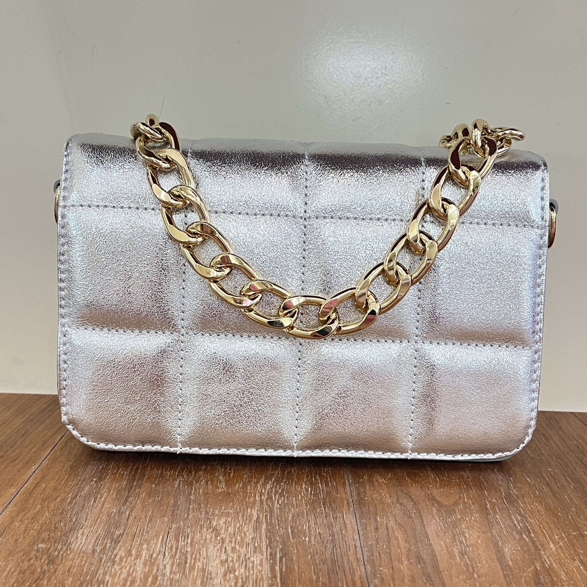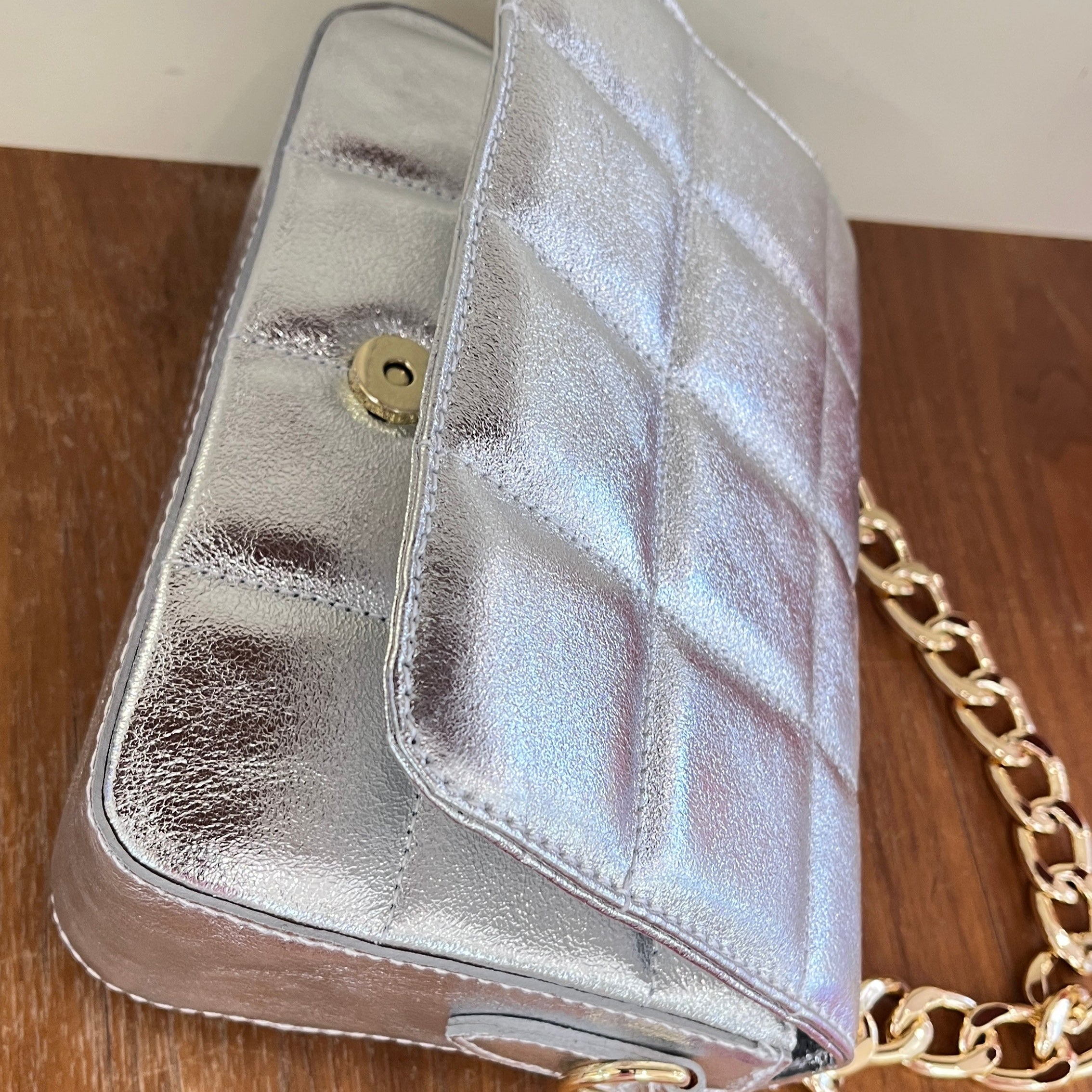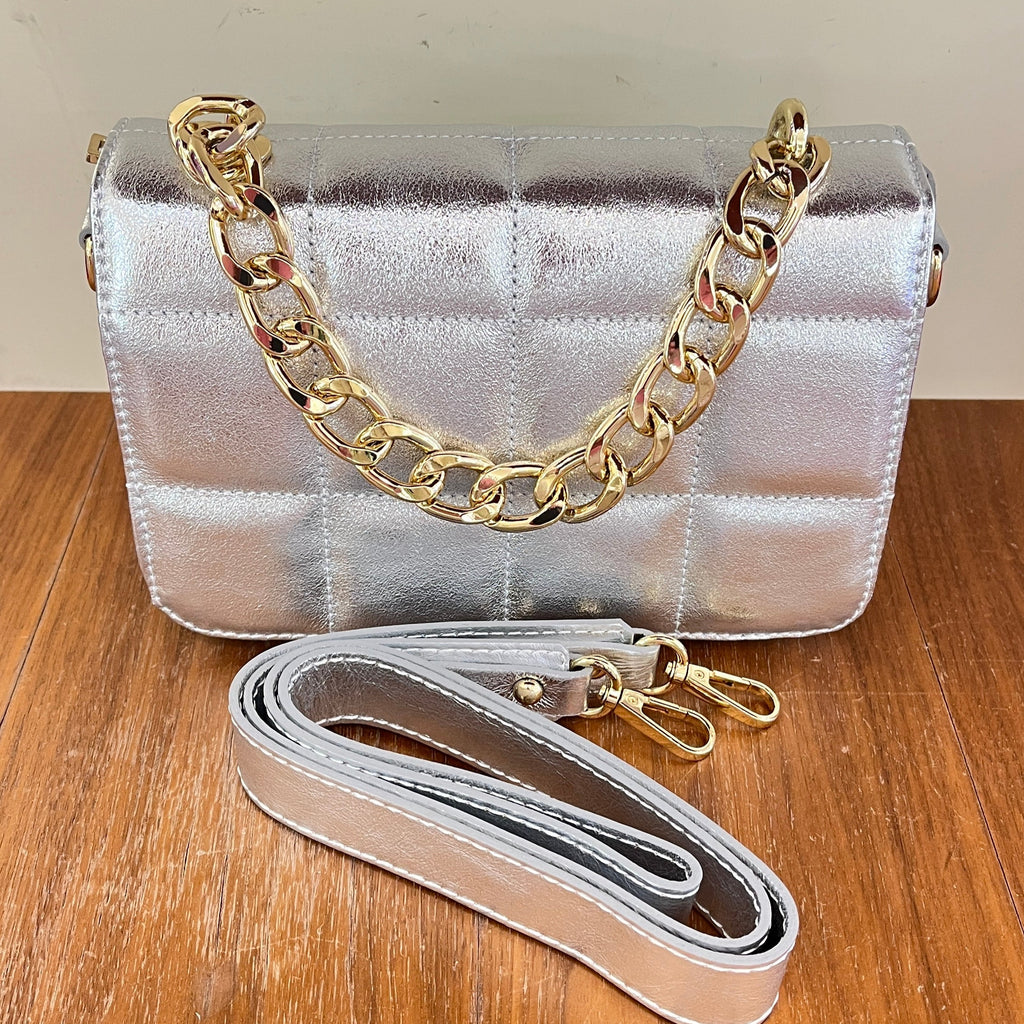 A soft grained silver leather  handbag. This handbag comes with one centre zip and an interior  zip pocket. It has an adjustable/detachable  leather strap that can be worn on the shoulder or crossbody and a gold chain strap. We sell other decorative and  chain straps  separately if you'd like to change up your look.