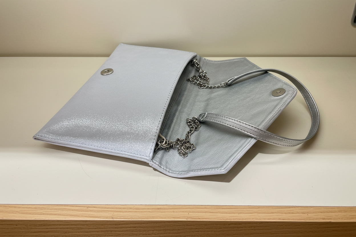 Fabucci Silver Shimmer Envelope  Clutch Bag . This clutch bag, designed for special occasions, features a magnetic closure and a detachable chain strap, allowing it to be carried by hand or worn over the shoulder. Dimensions:  27 x14 x  2 cm. Hardware: Silver