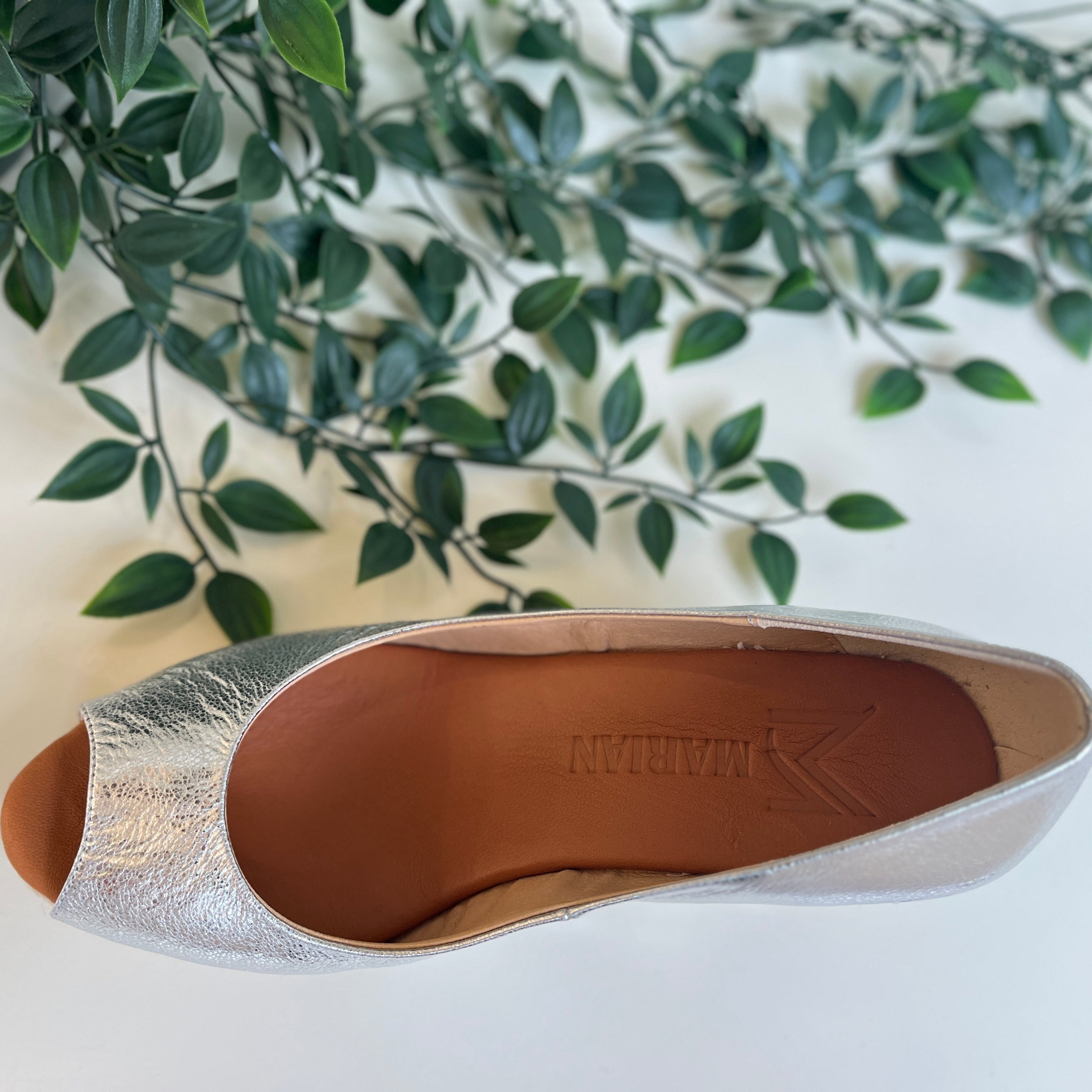 Elevate your summer style with the MARIAN Silver Peep Toe Wedge Espadrille, designed with a supportive 70 mm leather wedge sole for all-day comfort from daytime outings to evening events. Crafted with a leather upper and lining, this expertly made shoe from Spain offers a true-to-size fit and timeless elegance. Style code: 80202.